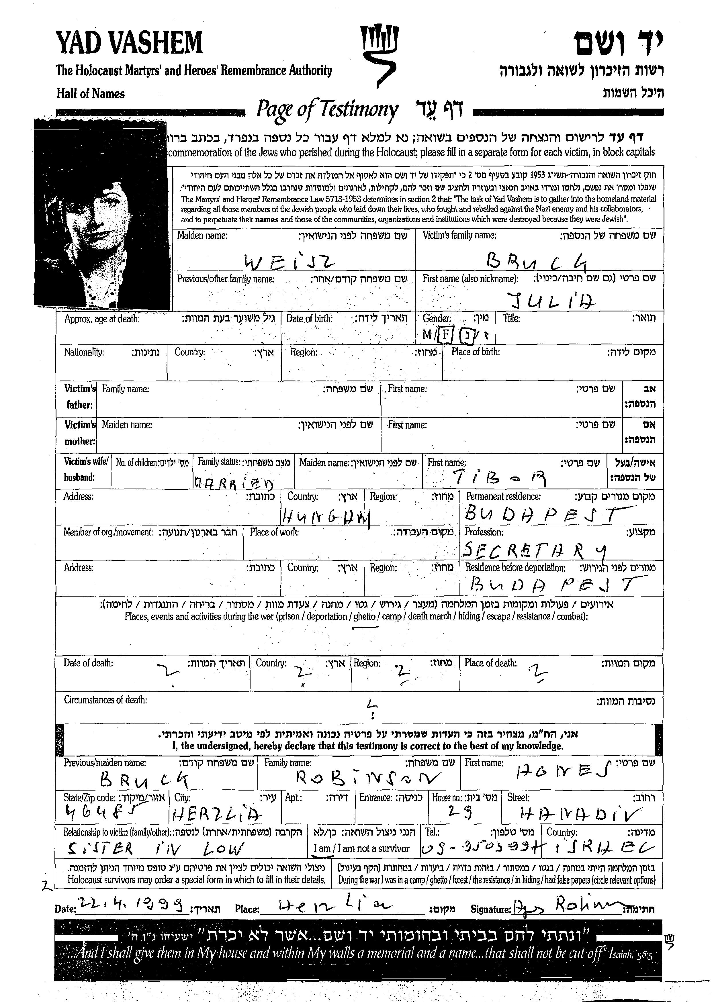 Юлия Брух, девичья фамилия Вейс. Секретарь. Место жительства до войны: Будапешт, Венгрия.