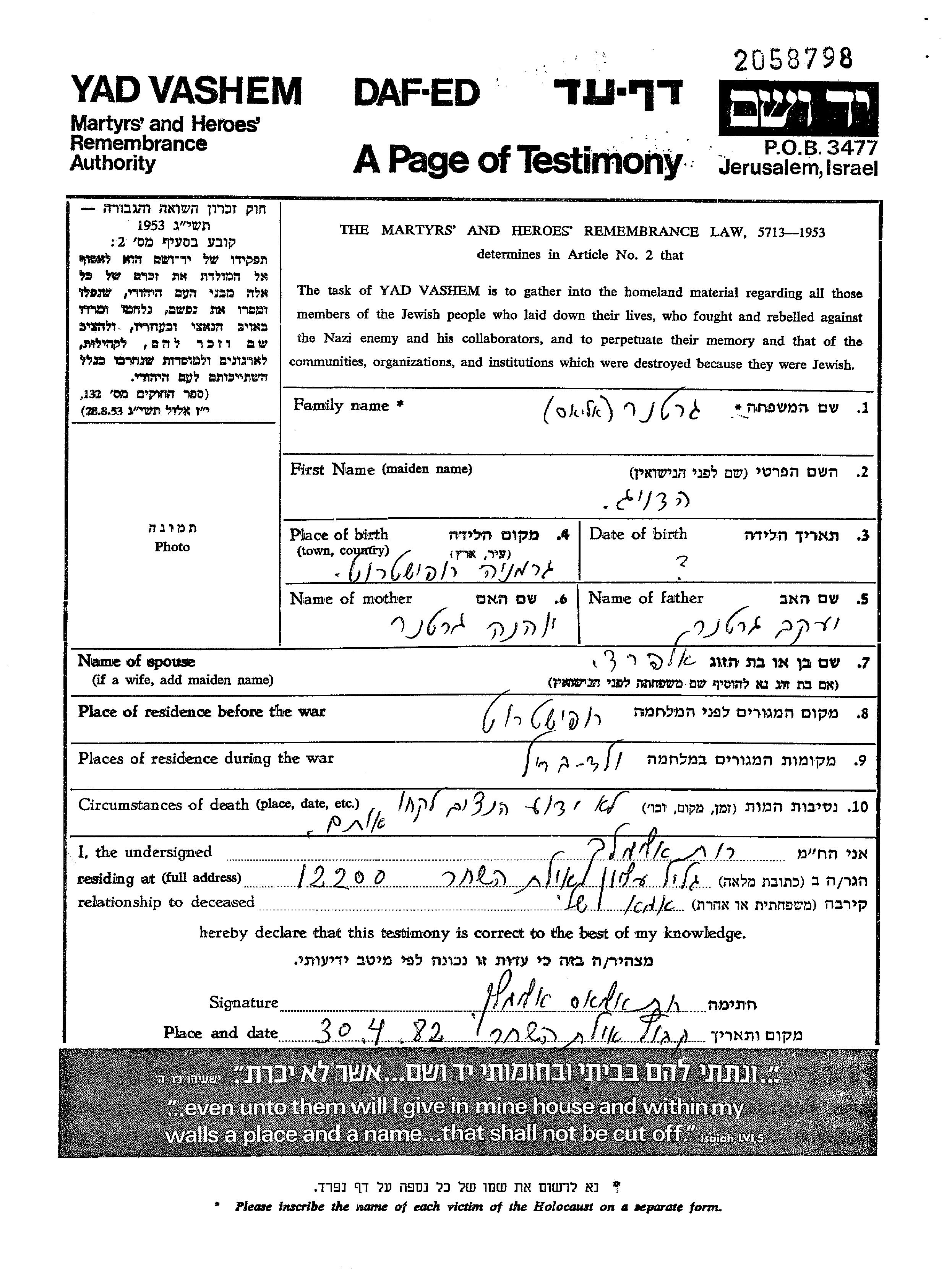 Яд Вашем - Листы свидетельских показаний Мемориального фонда