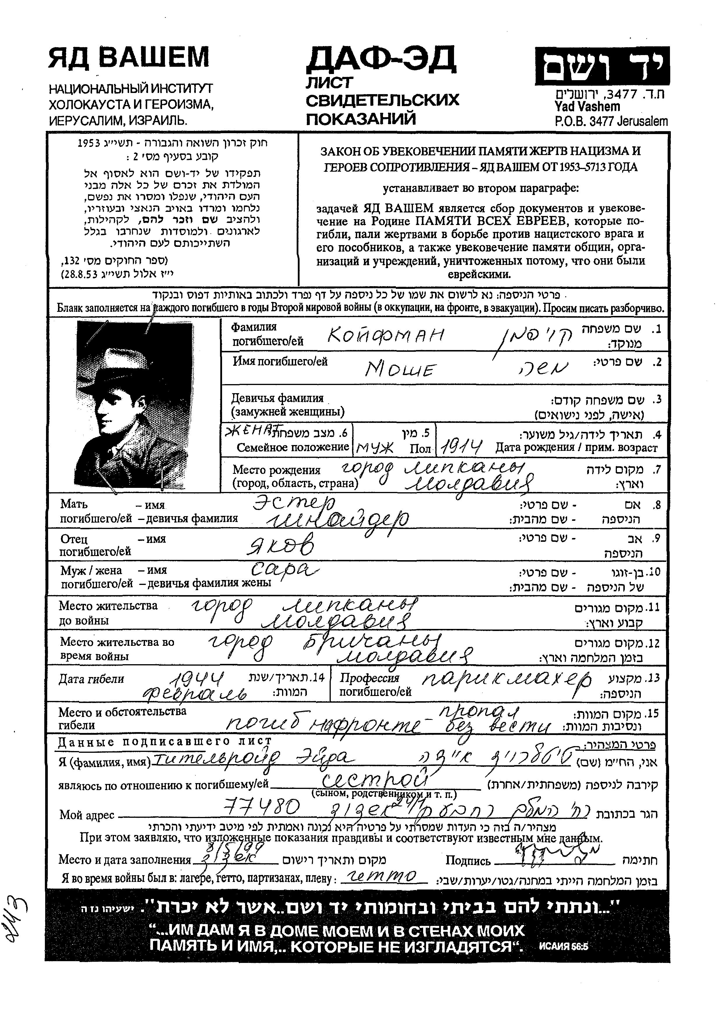 Моше Койфман, место рождения: Липкань Сат, Румыния. Парикмахер. Место жительства до войны: Липкань Сат, Румыния.