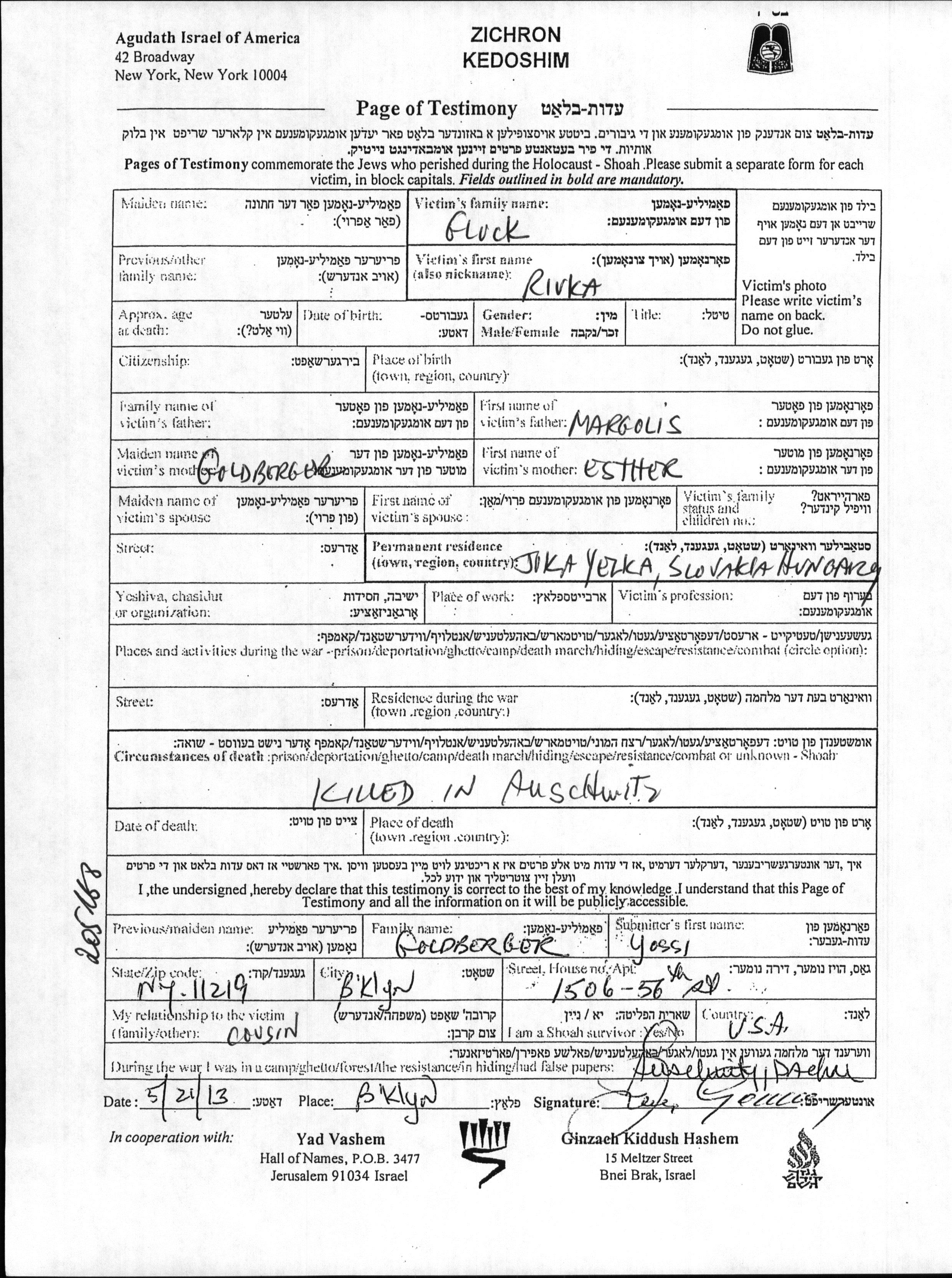 Глюк Ривка Елька, Чехословакия Лист свидетельских показаний