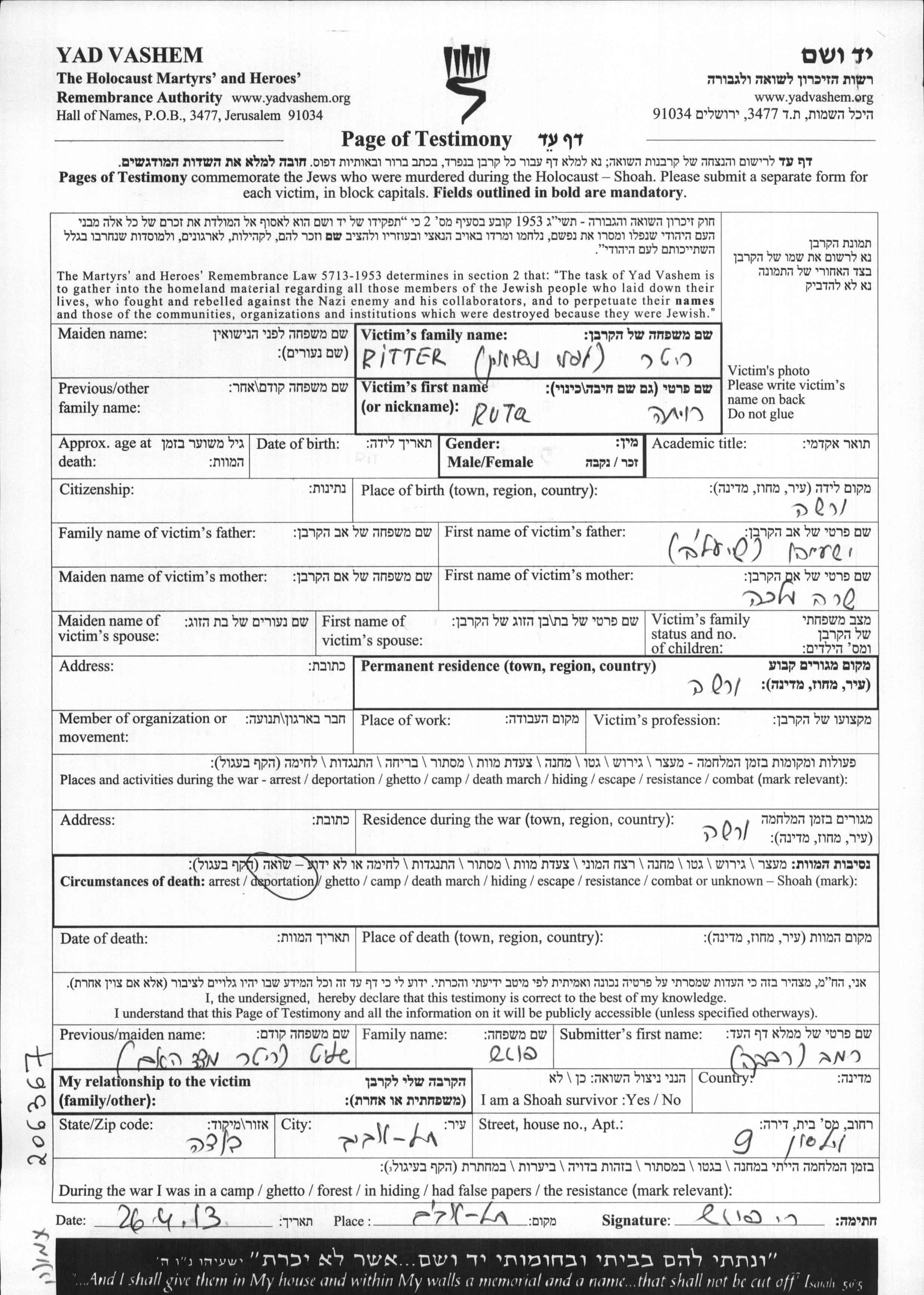 | Фамилия неизвестна | Рута | Варшава, Польша | Лист свидетельских показаний | |