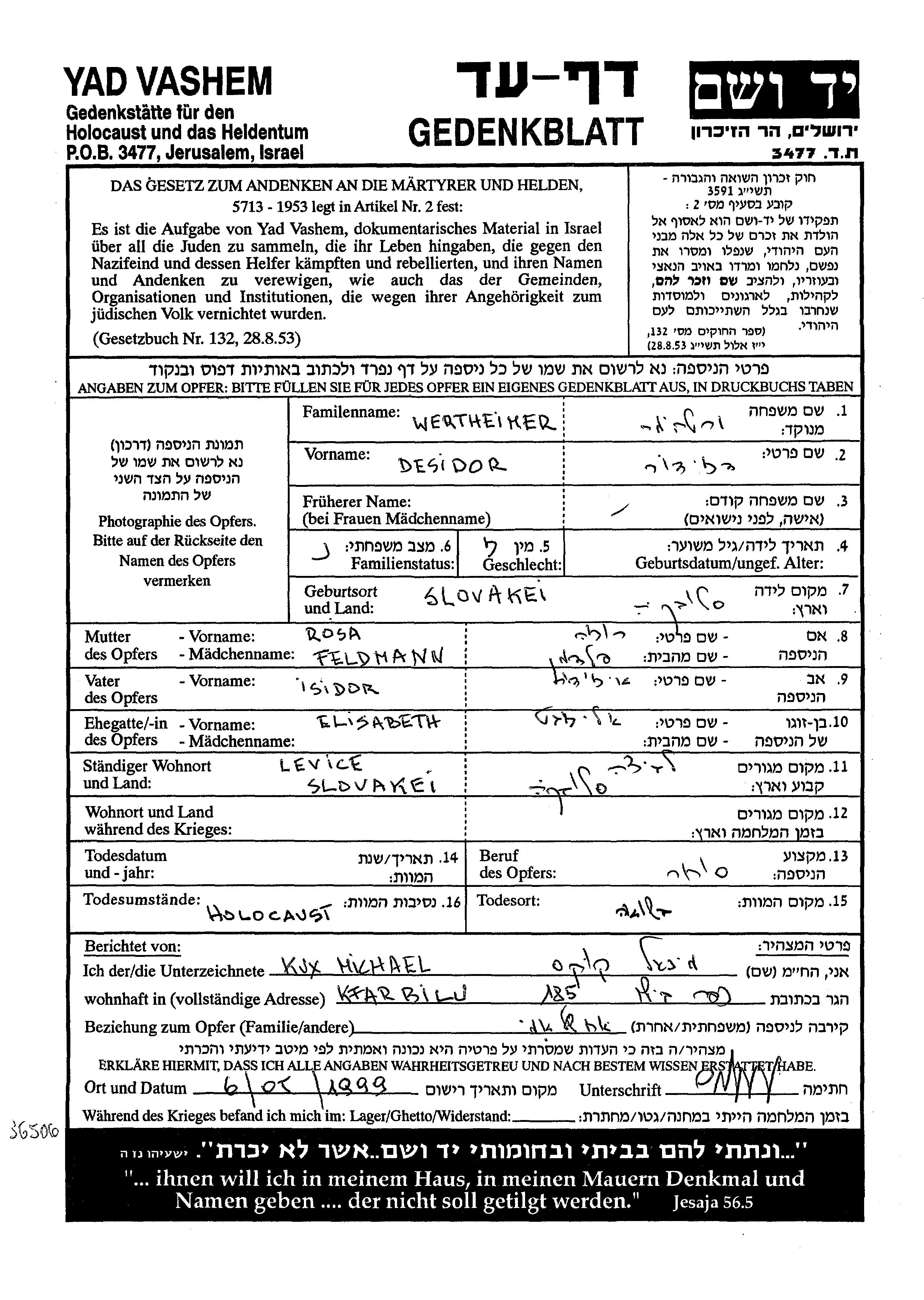 Вертхаймер Дезидор Левице, Чехословакия Лист свидетельских показаний