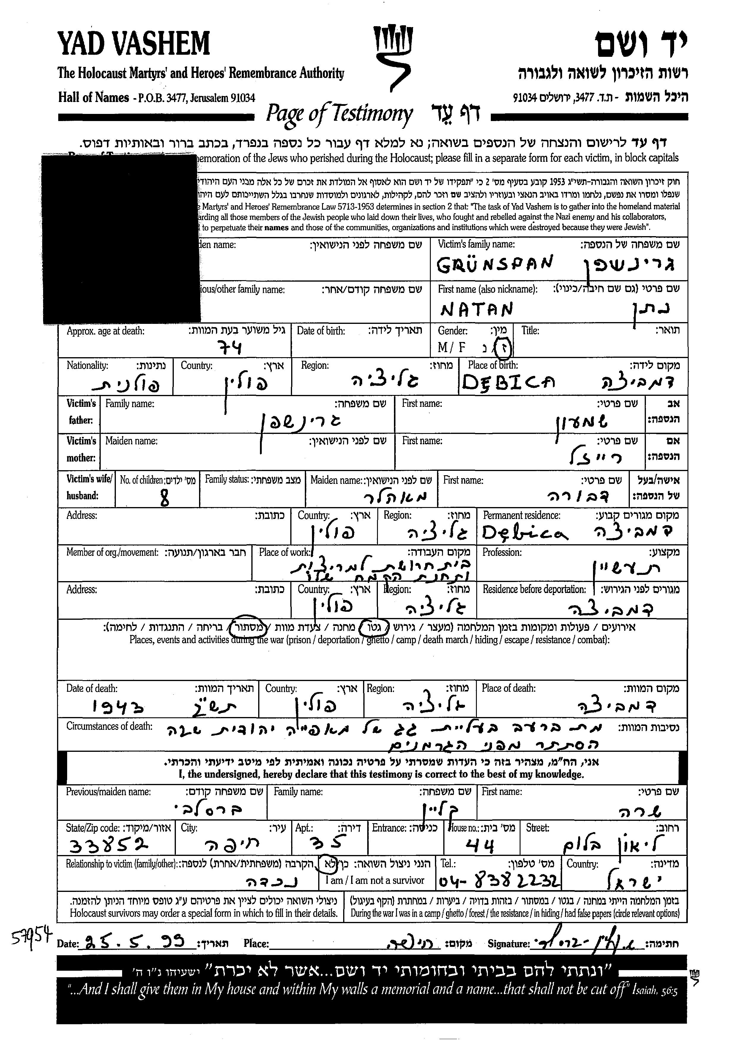 Груншпан Натан Дембица, Польша Лист свидетельских показаний
