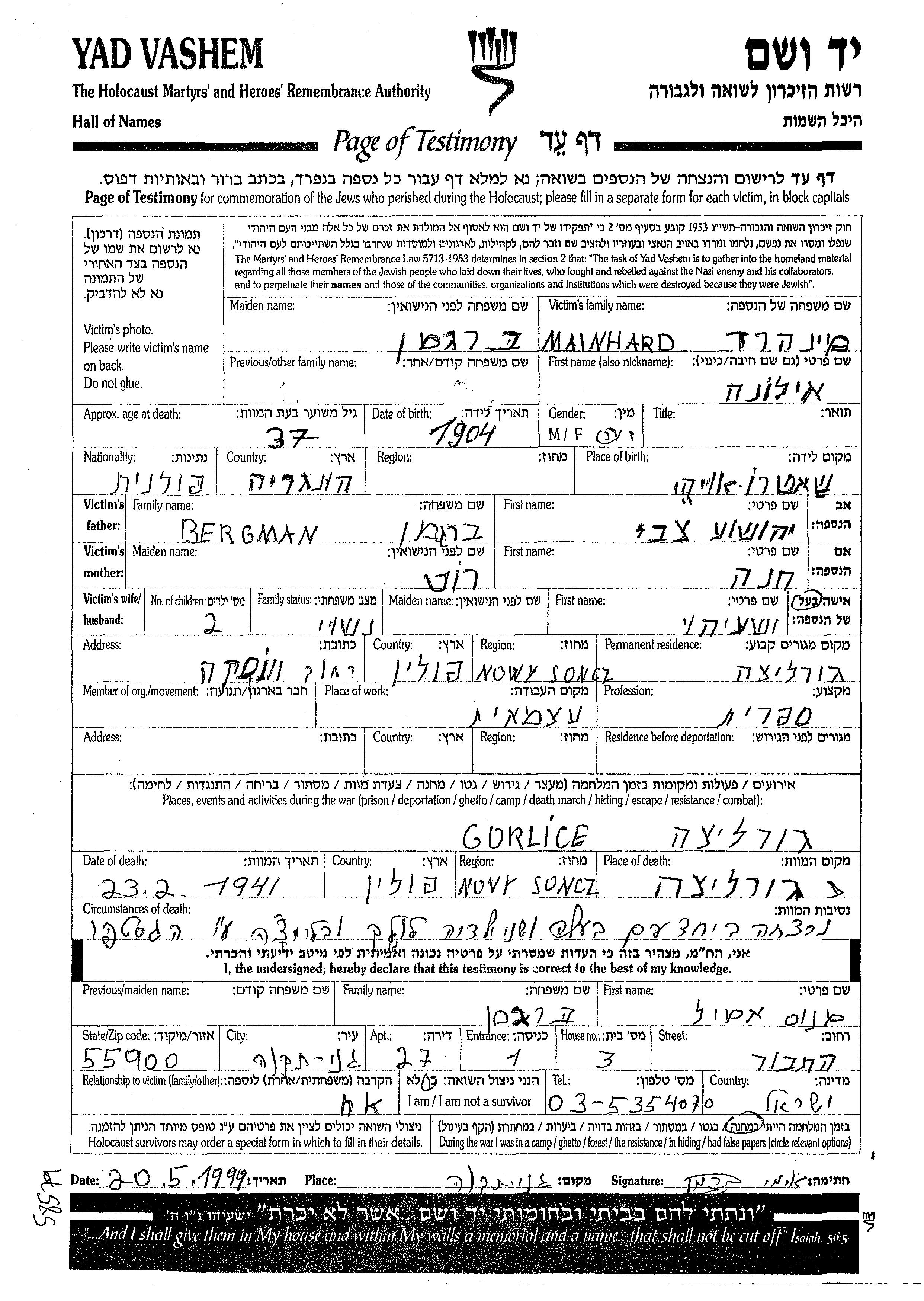 Майнхард | Илона | 1904 | Горлице, Польша | Лист свидетельских показаний |