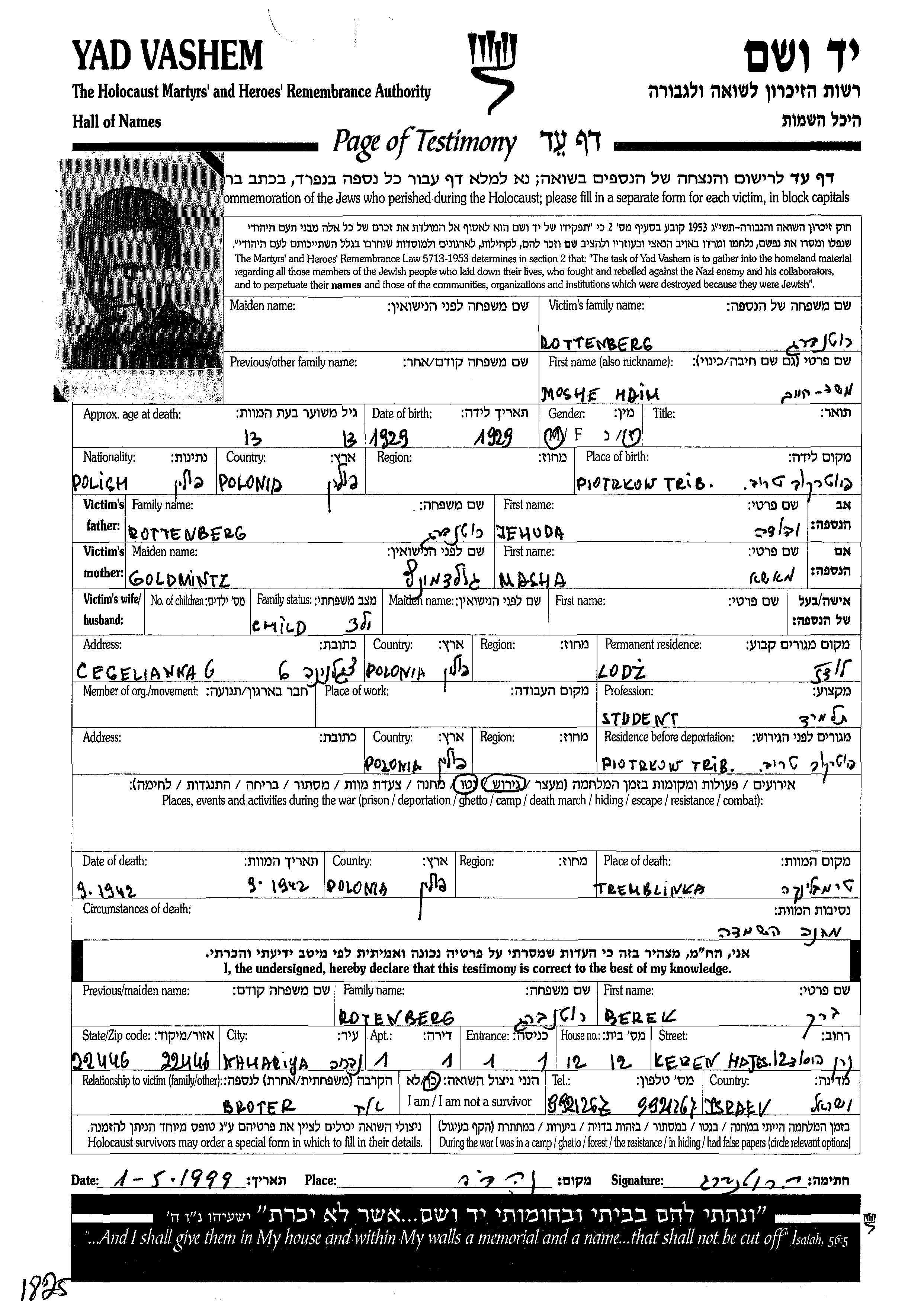 Хаим Моше Роттенберг, место рождения: Пётркув-Трыбунальски, Польша. Ученик / ученица. Место жительства до войны: Лудзь, Польша.