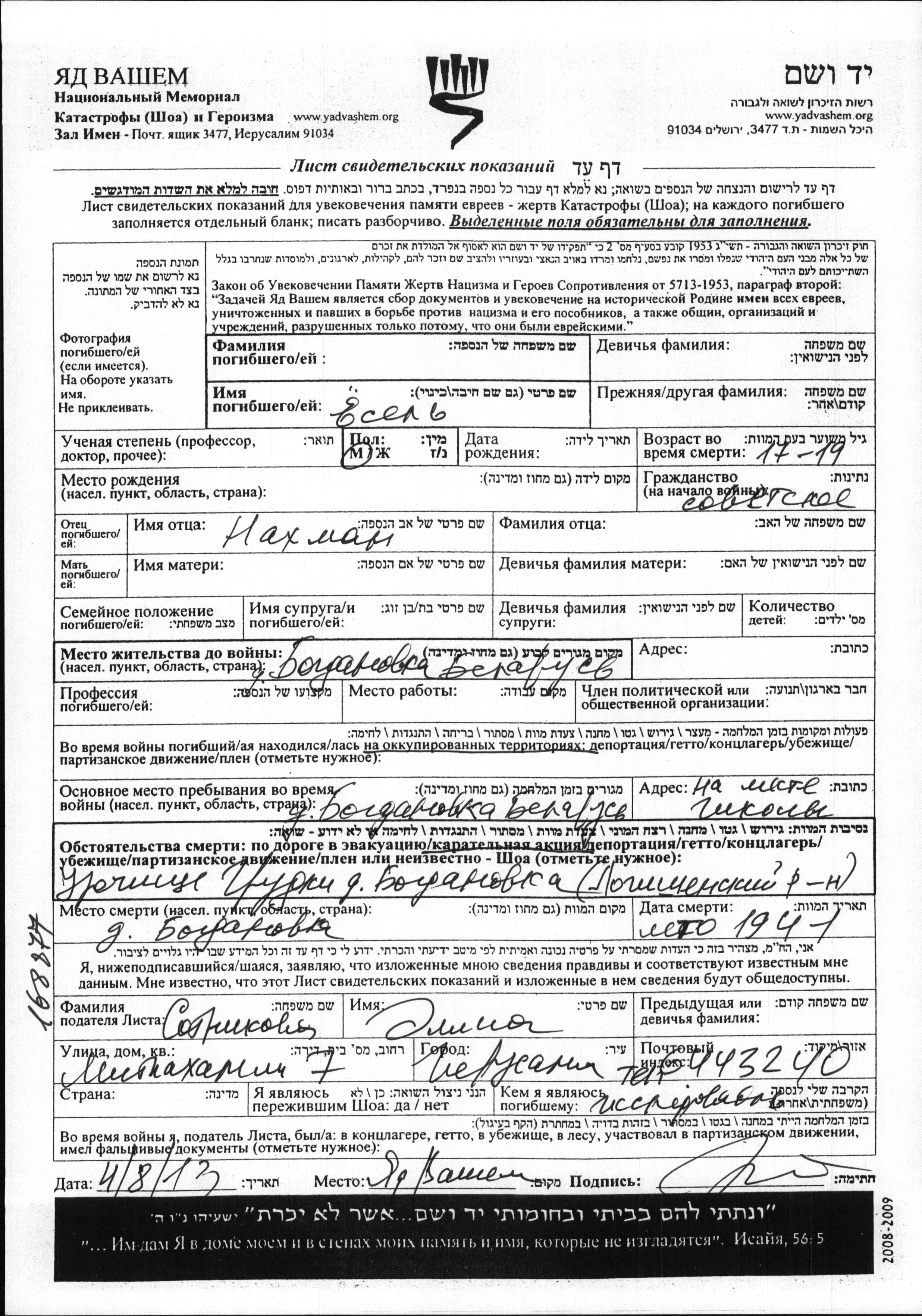 Фамилия неизвестна | Йосел | Богдановка, СССР | Лист свидетельских показаний | |