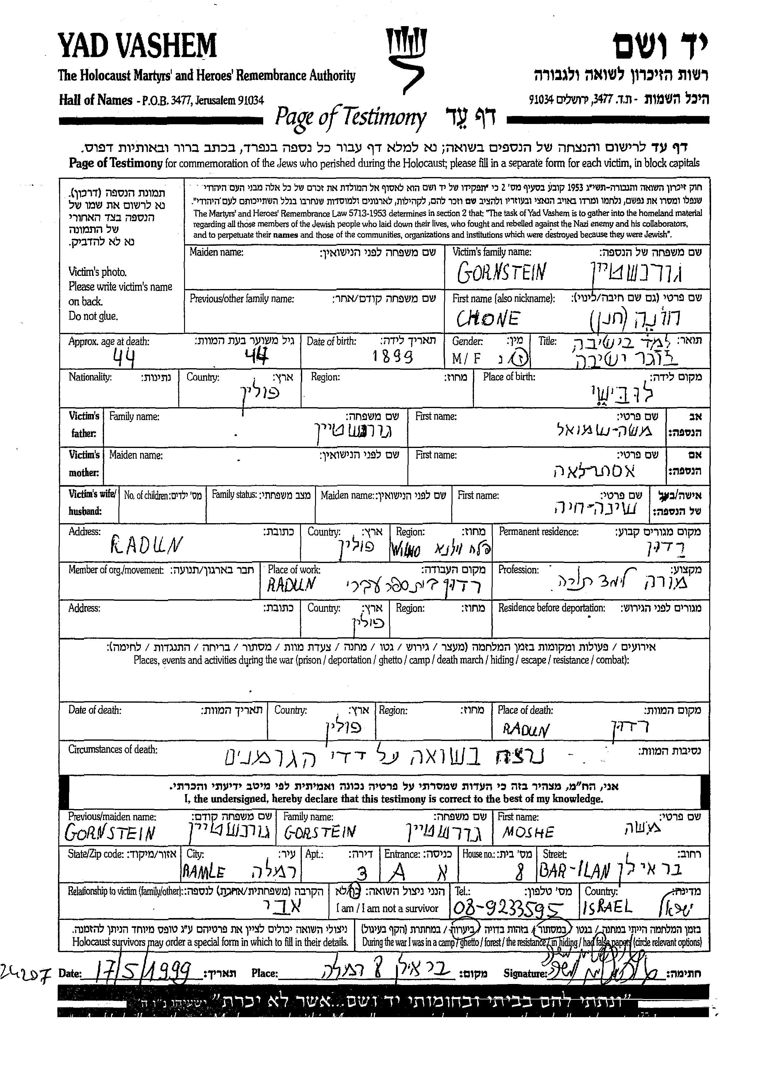 Горнштайн Хоне 1899 Радунь, Польша Лист свидетельских показаний