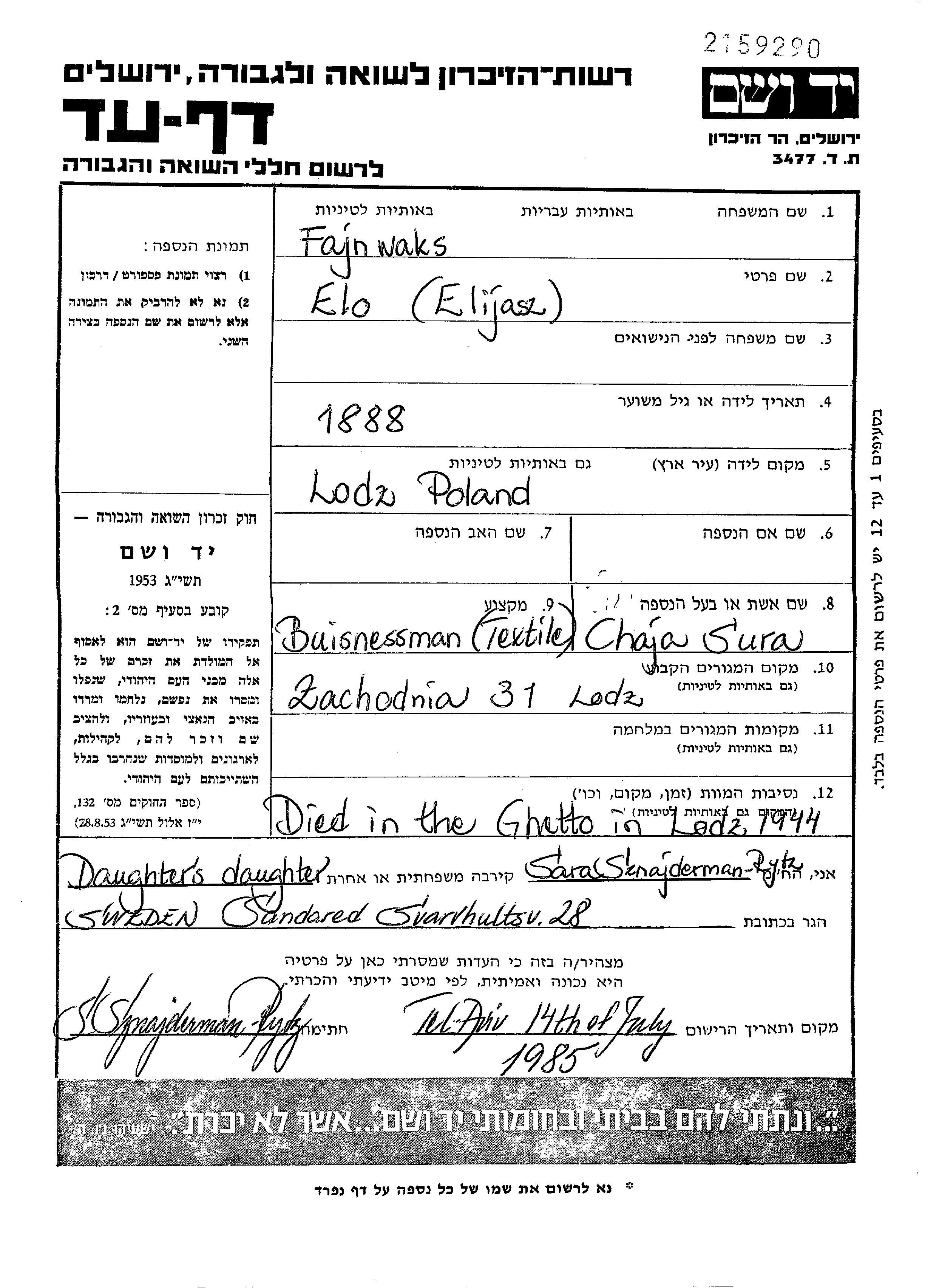 Эло Файнвакс, место рождения: Лодзь, Польша. Предприниматель. Женат / замужем. Место жительства до войны: Лодзь, Польша. Место во время войны: Польша.
