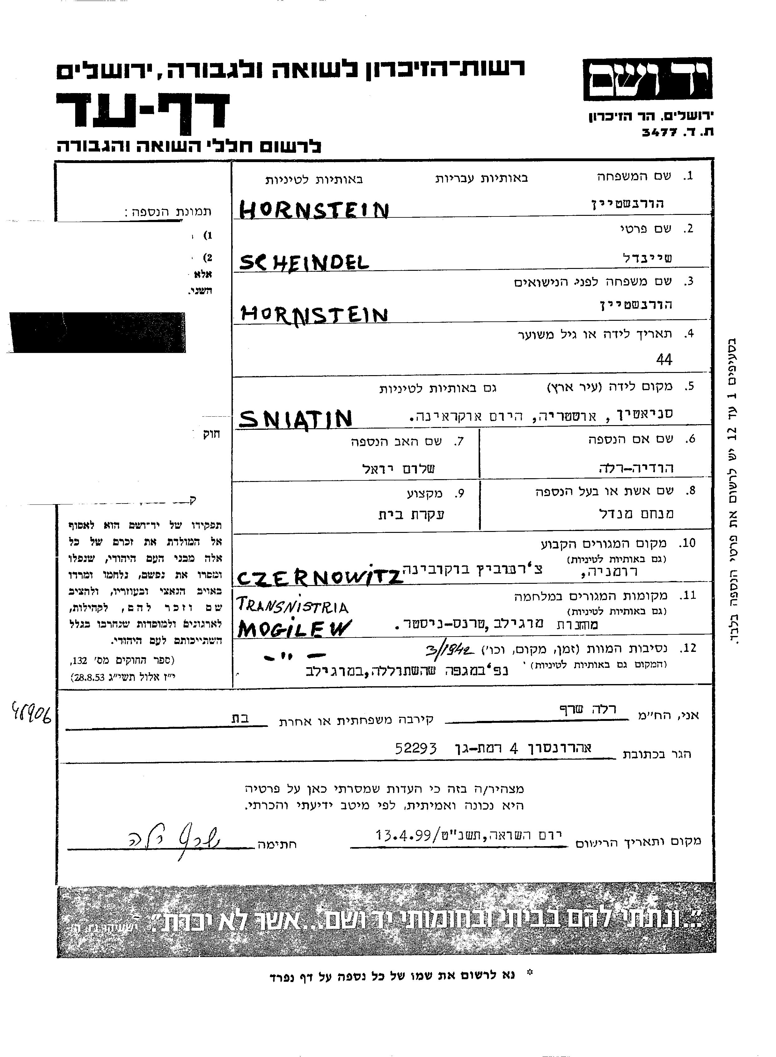 Хорнштейн Шейндель Черновцы, Румыния Лист свидетельских показаний