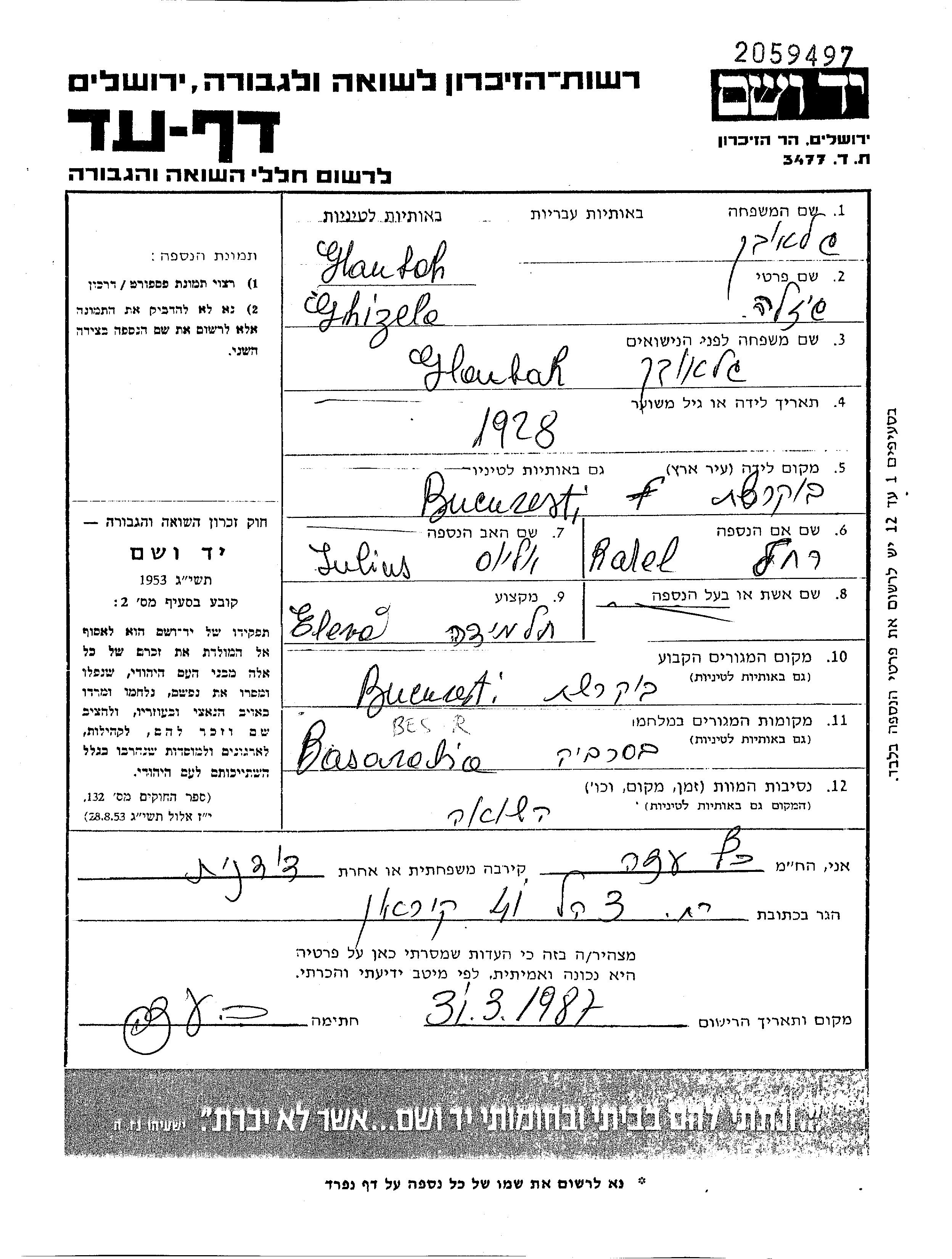Глаубах Гизела 1928 Бухарест, Румыния Лист свидетельских показаний