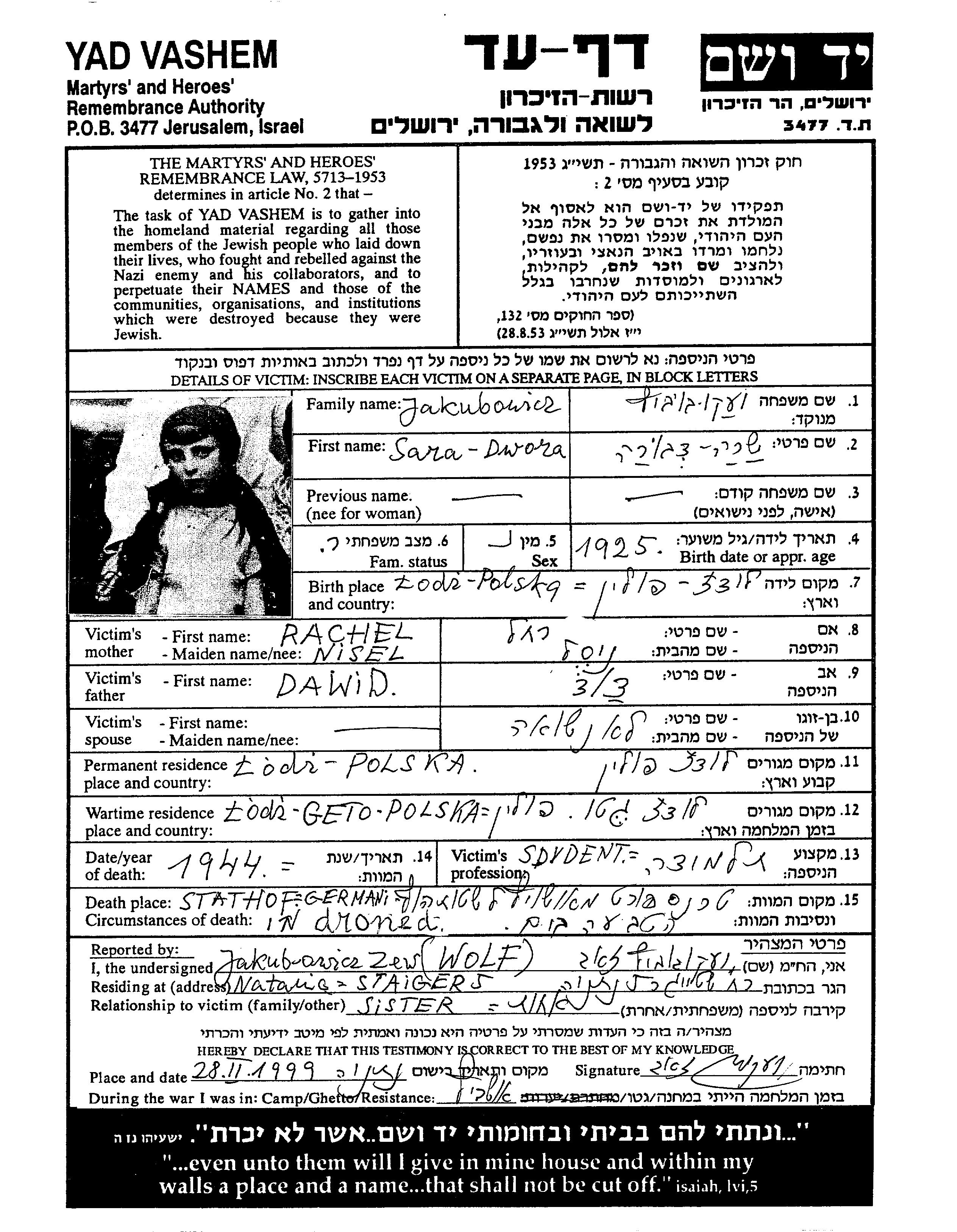 | Якубович | Сара Двора | 1925 | Лодзь, Польша | Лист свидетельских показаний |
