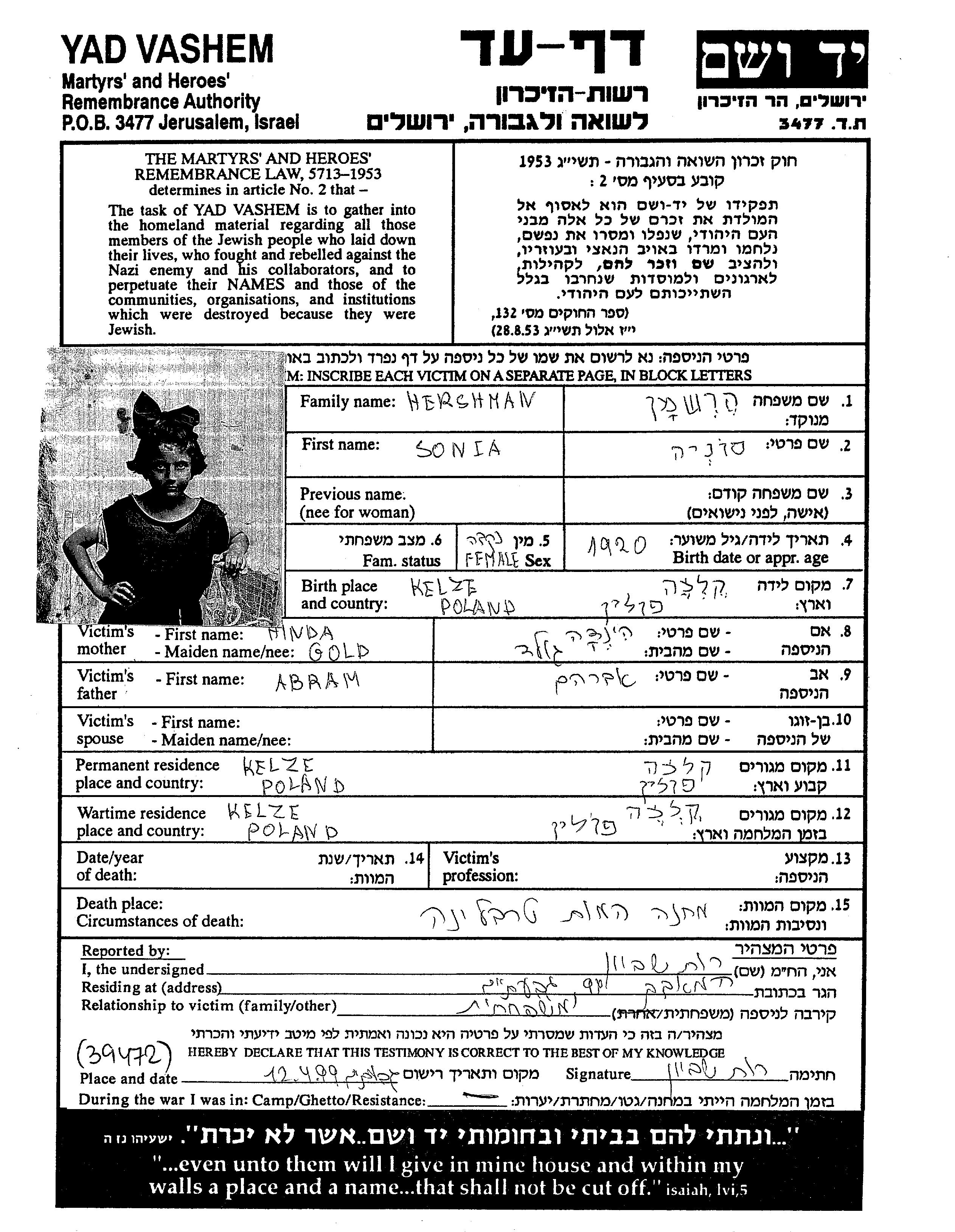 Хершман Соня 1920 Кельце, Польша Лист свидетельских показаний