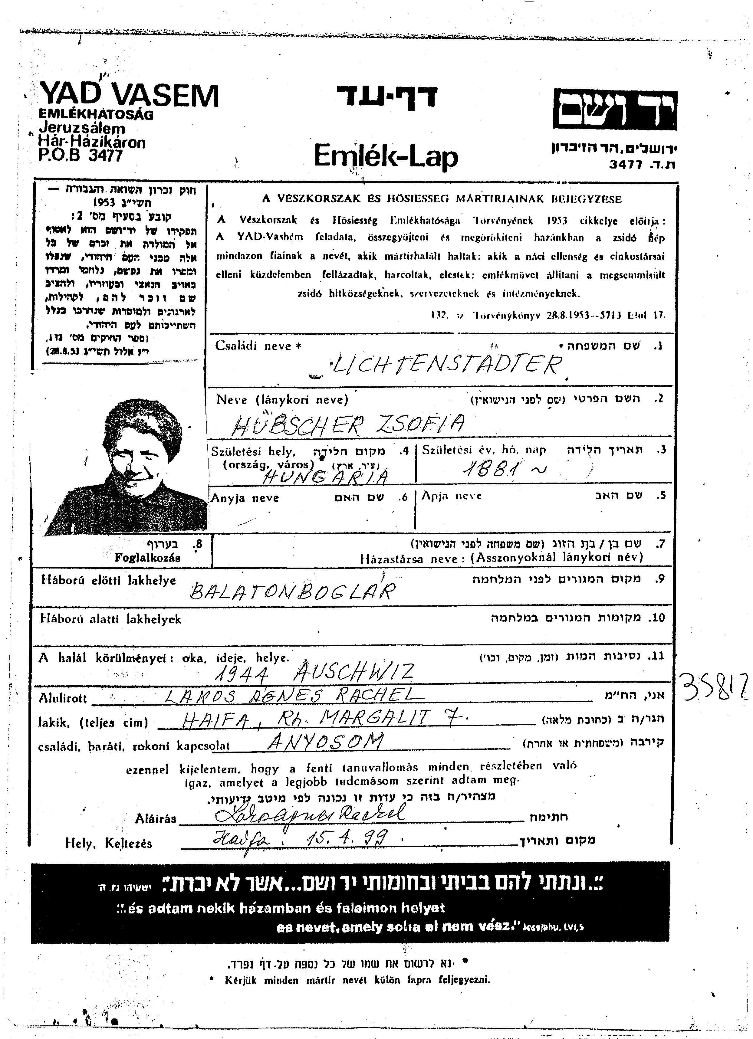 Зофия Лихтенштедтер, девичья фамилия Хюбшер, место рождения: Венгрия. Место жительства до войны: Балатонбоглар, Венгрия.