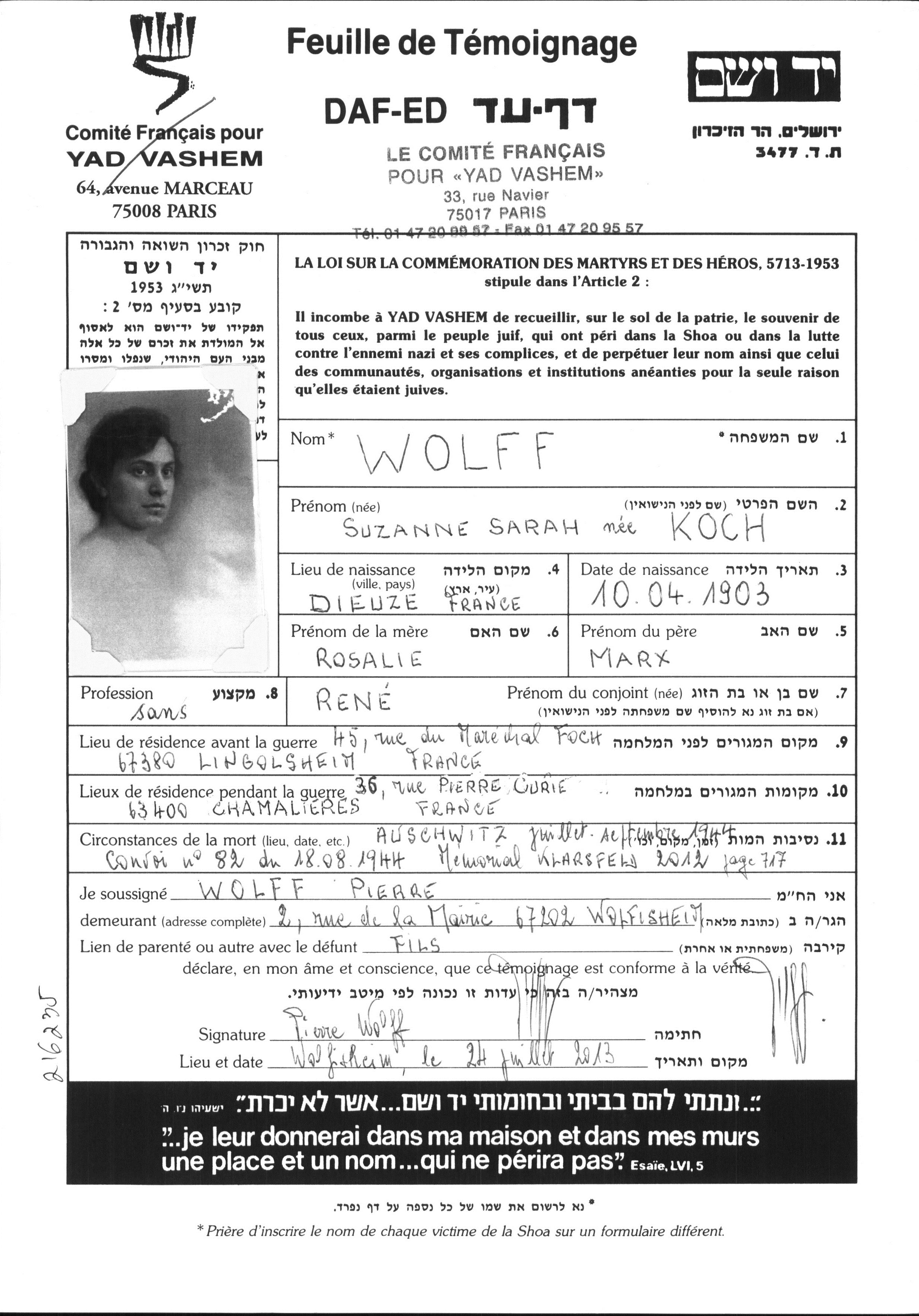 Вольф | Сюзанна Сара | 1903 | Лингольсхейм, Франция | Лист свидетельских показаний |