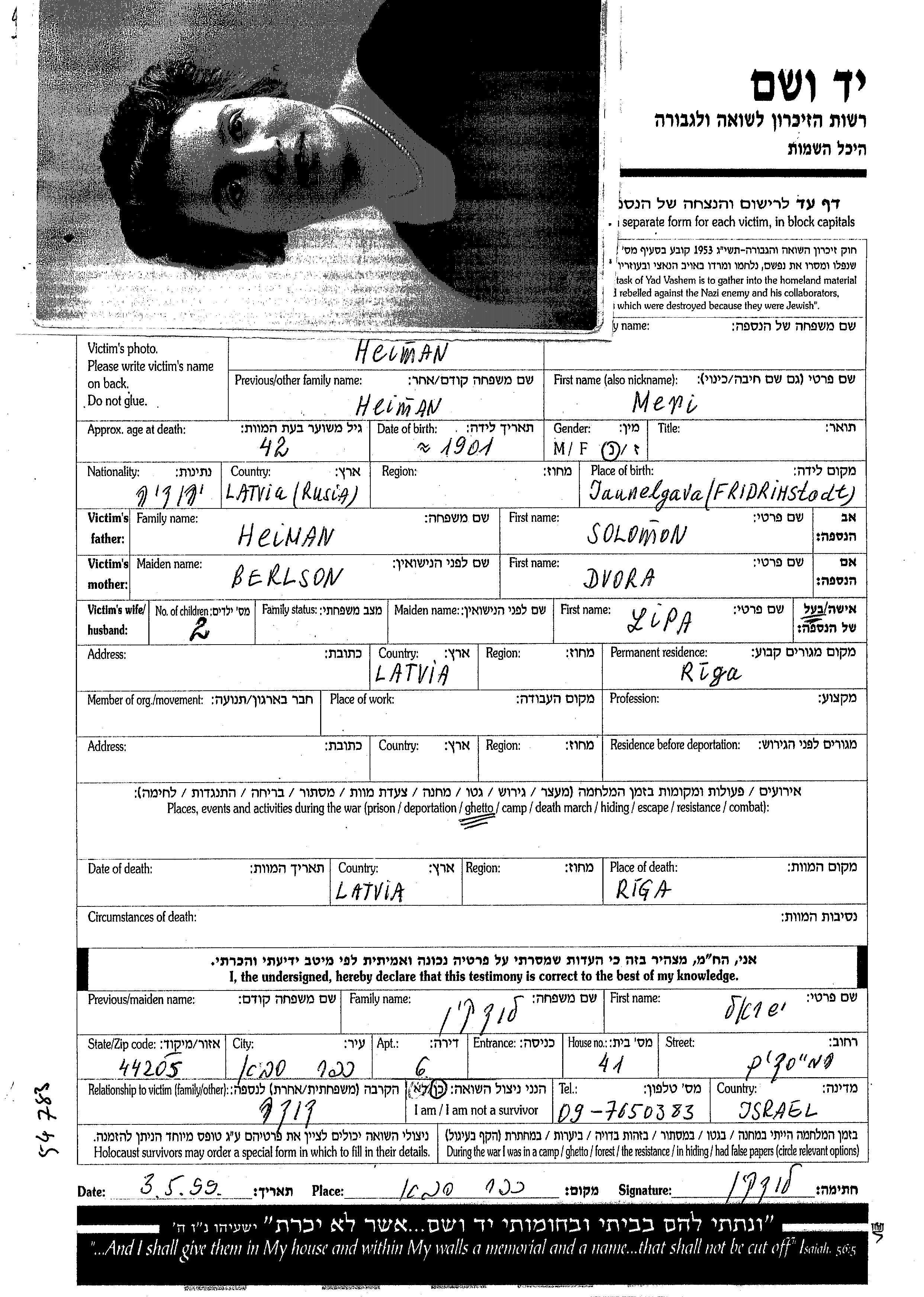 Мари Хейман, девичья фамилия Хейман, место рождения: Яунелгава, Латвия. Место жительства до войны: Рига, Латвия.
