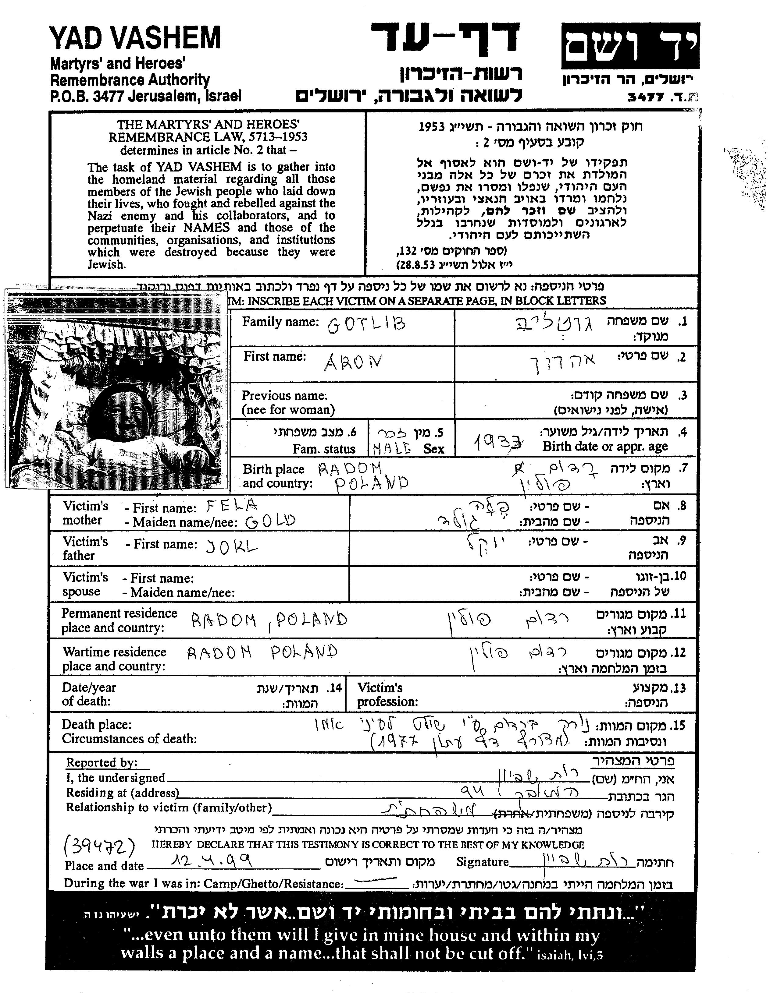 Готлиб Арон 1933 Радом, Польша Лист свидетельских показаний