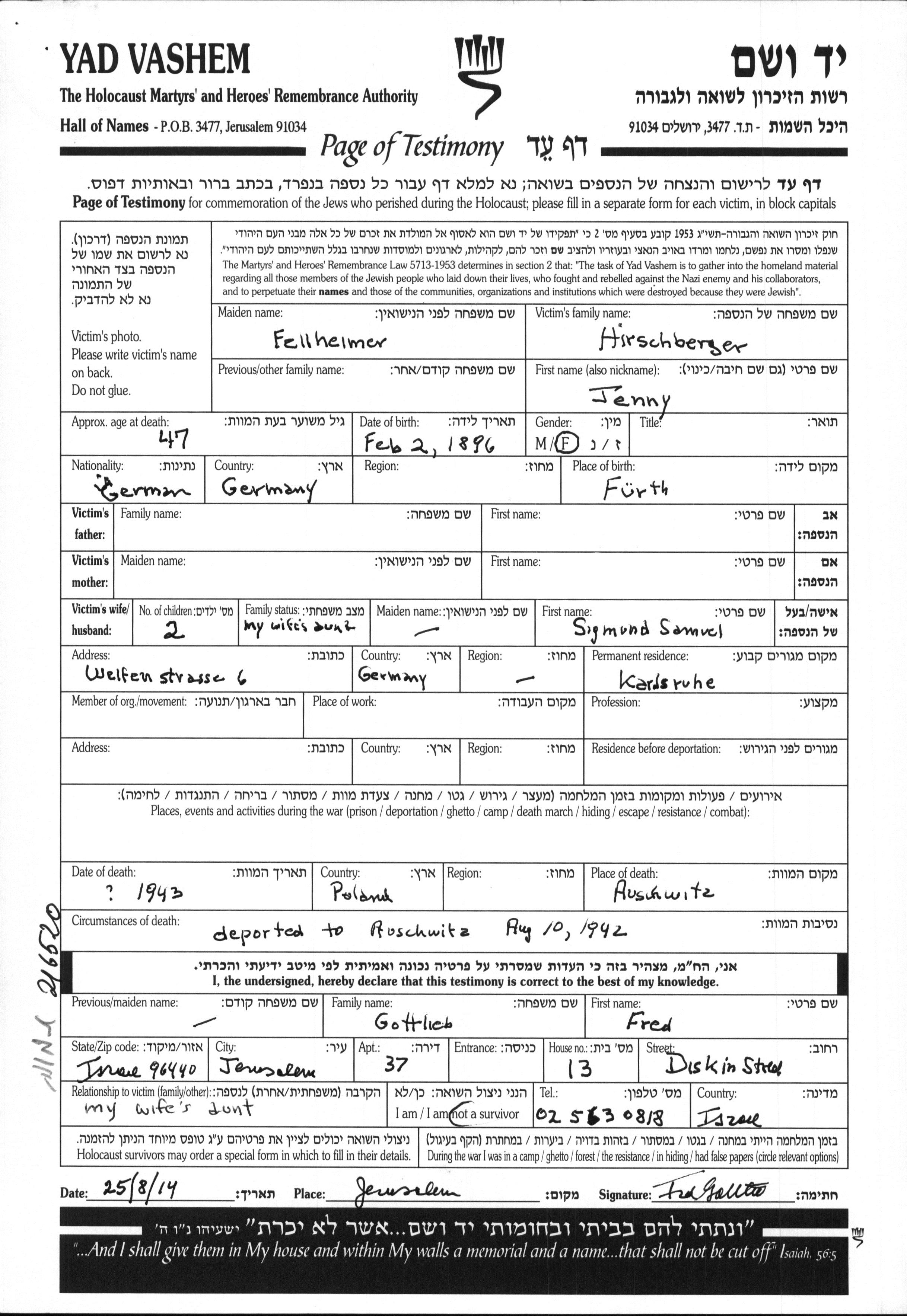 | Фельхаймер | Дженни | 1896 | Карлсруэ, Германия | Лист свидетельских показаний |