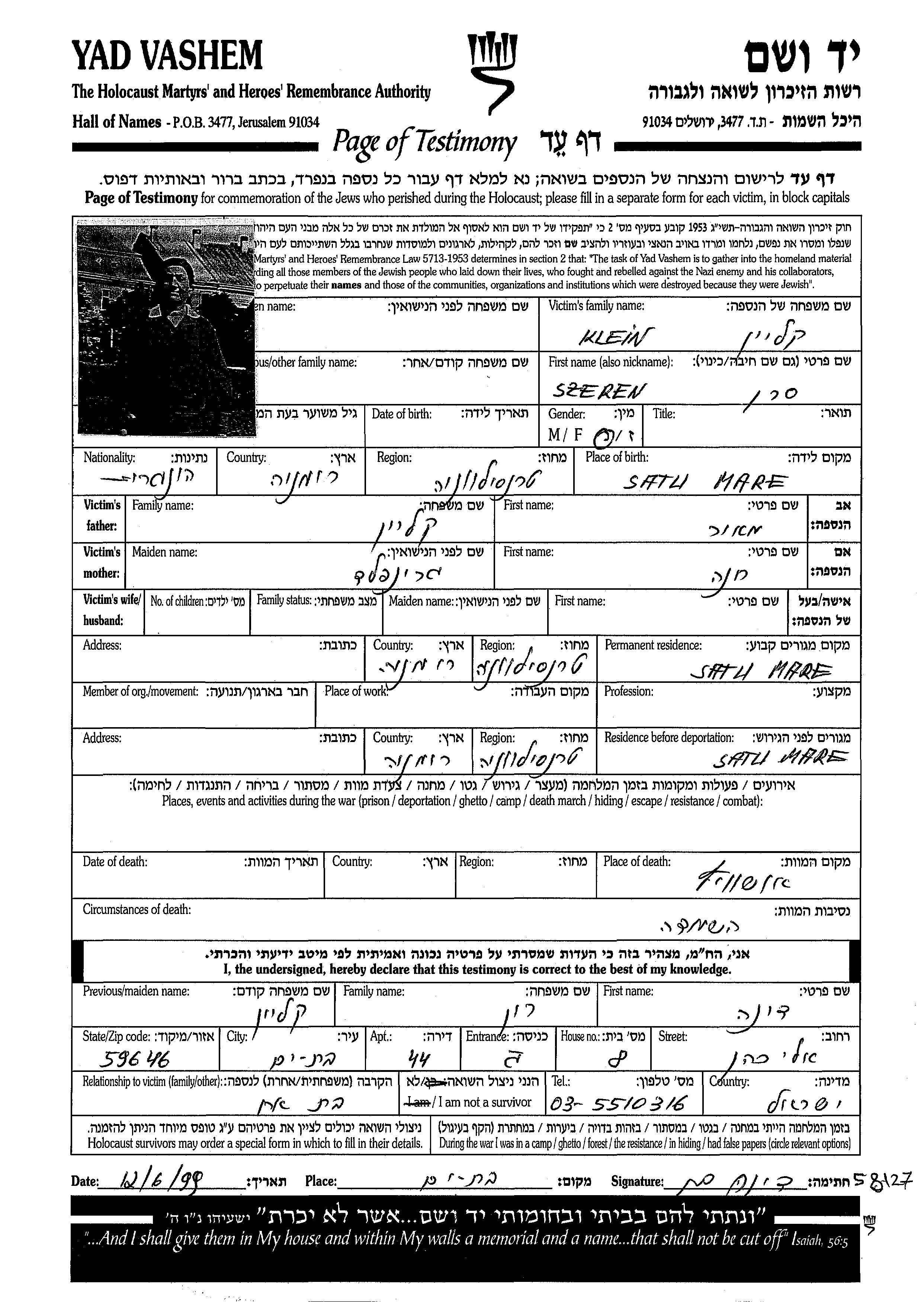 Серен Клейн, место рождения: Сату-Маре, Румыния. Место жительства до войны: Сату-Маре, Румыния.
