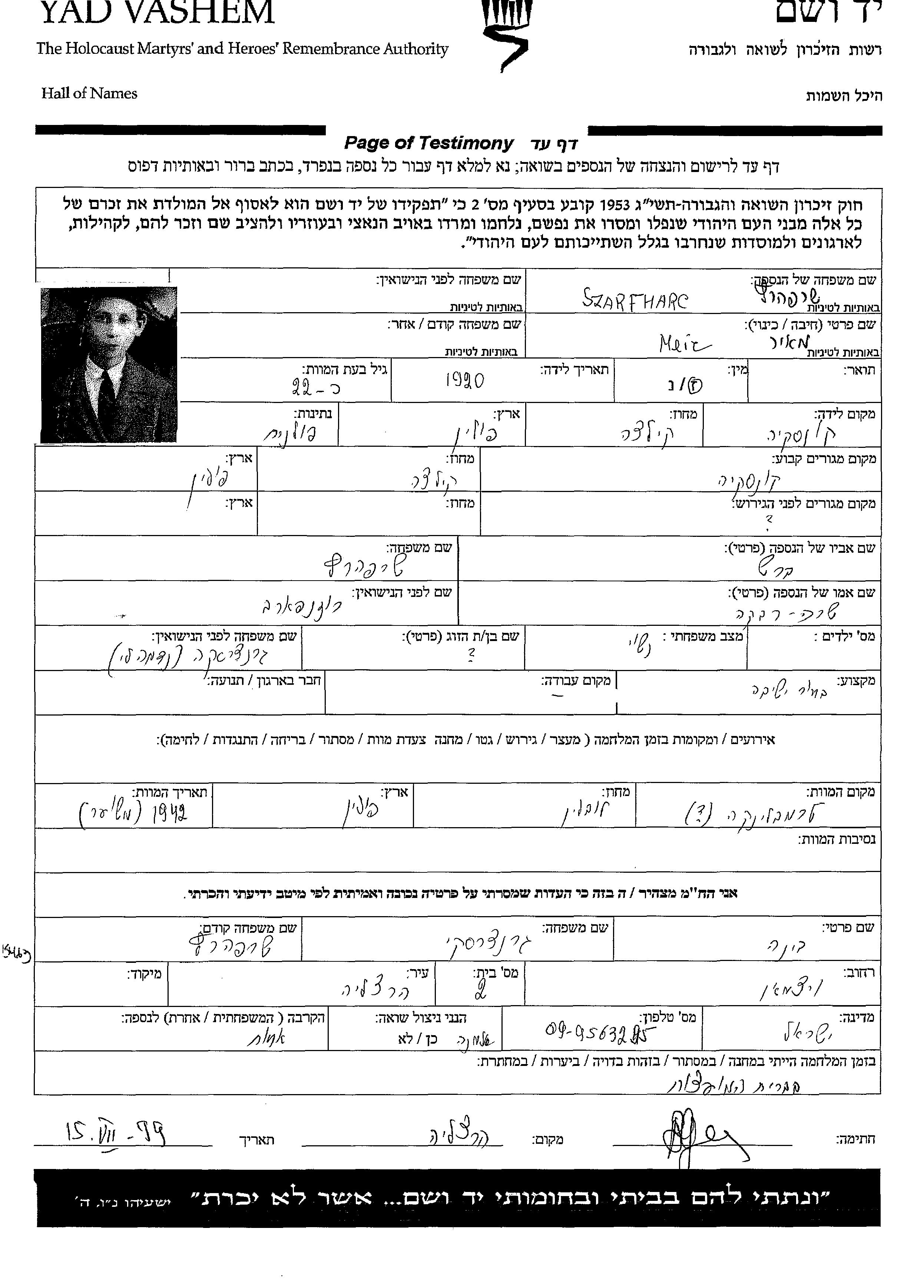 Шарфхарц | Меир | 1920 | Коньске, Польша | Лист свидетельских показаний |