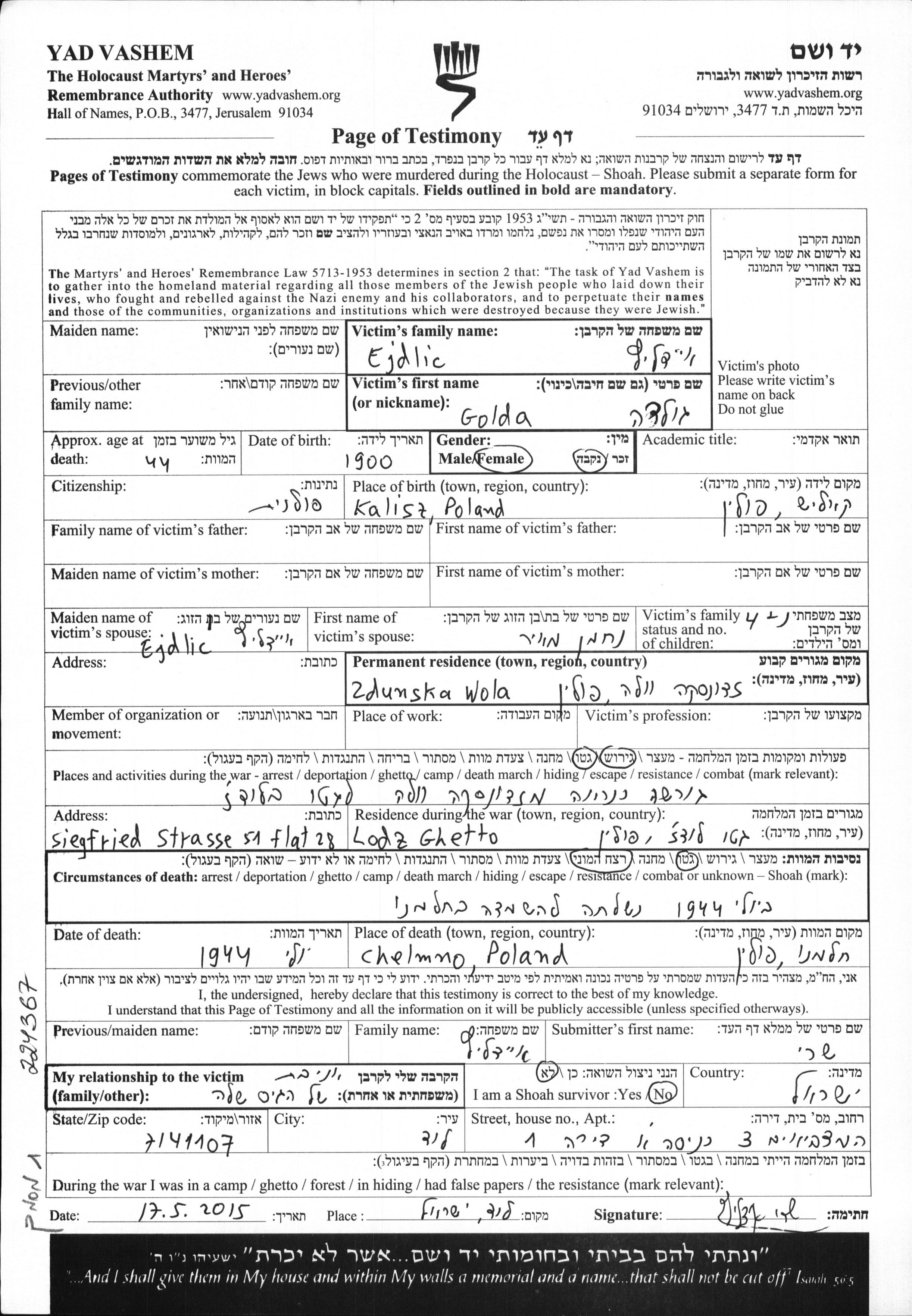 Голда уничтоженa в период Шоа. место смерти: Хелмно, Польша в 07/1944.