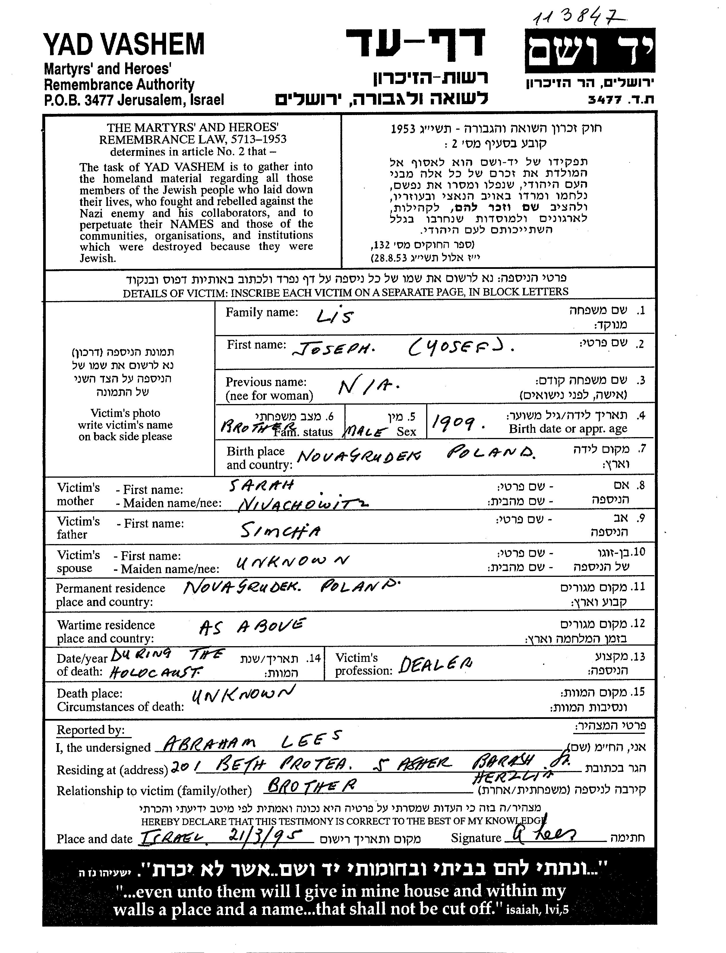 Лис | Йосеф | 1909 | Новогрудок, Польша | Лист свидетельских показаний |