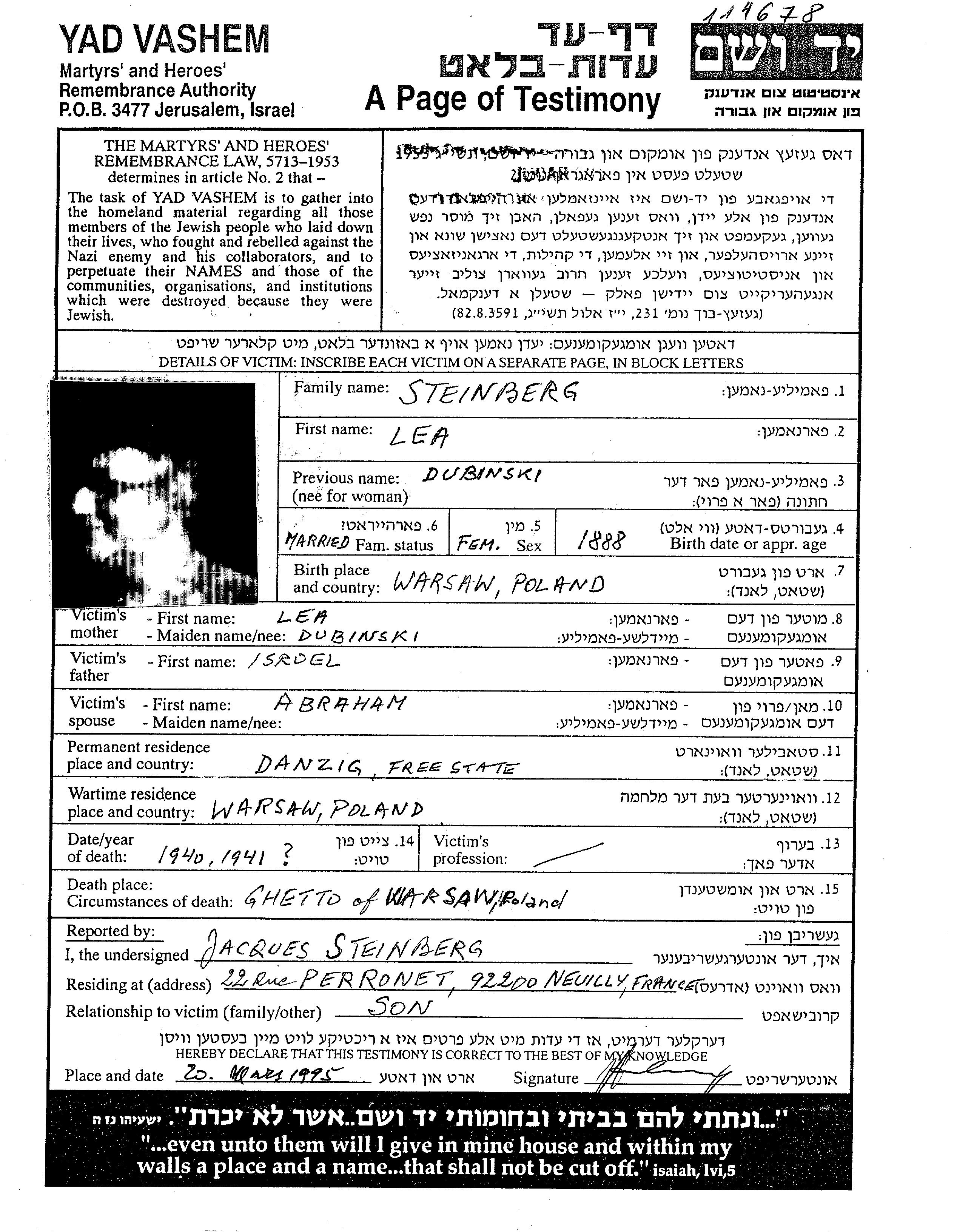 Лея Штайнберг, девичья фамилия Дубински, место рождения: Варшава, Польша. Место жительства до войны: Данциг, Данциг.
