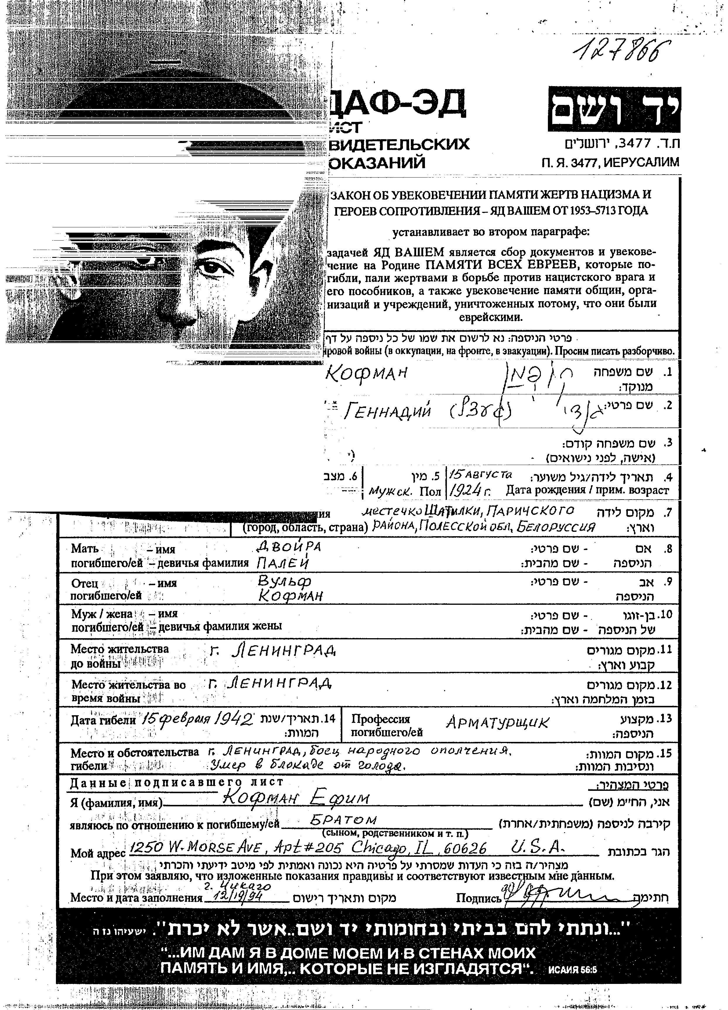 Кофман Геннадий 1924 Ленинград, Россия (СССР) Лист свидетельских показаний
