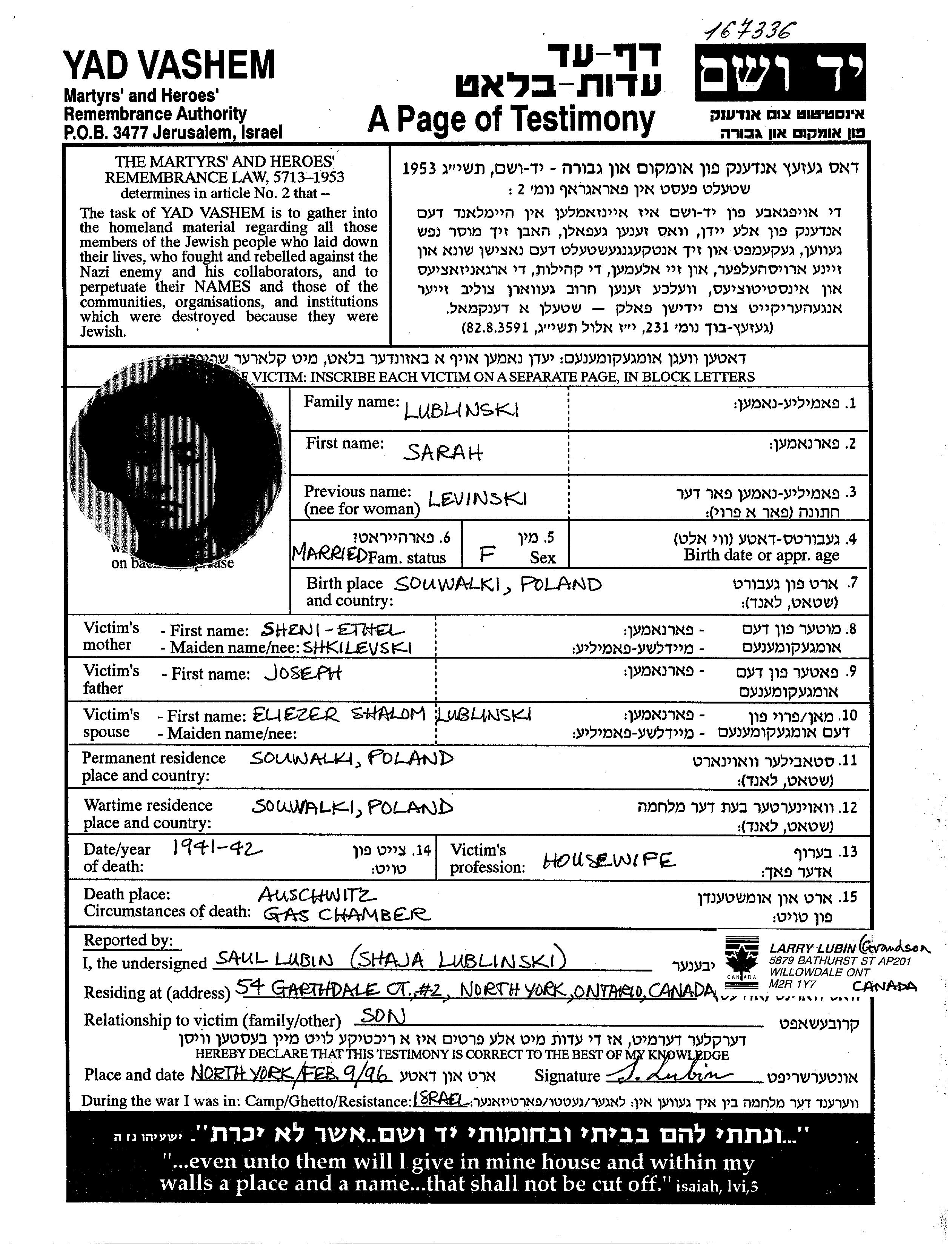 Сара Люблински, девичья фамилия Левински, место рождения: Сувалки, Польша. Домохозяйка. Место жительства до войны: Сувалки, Польша.