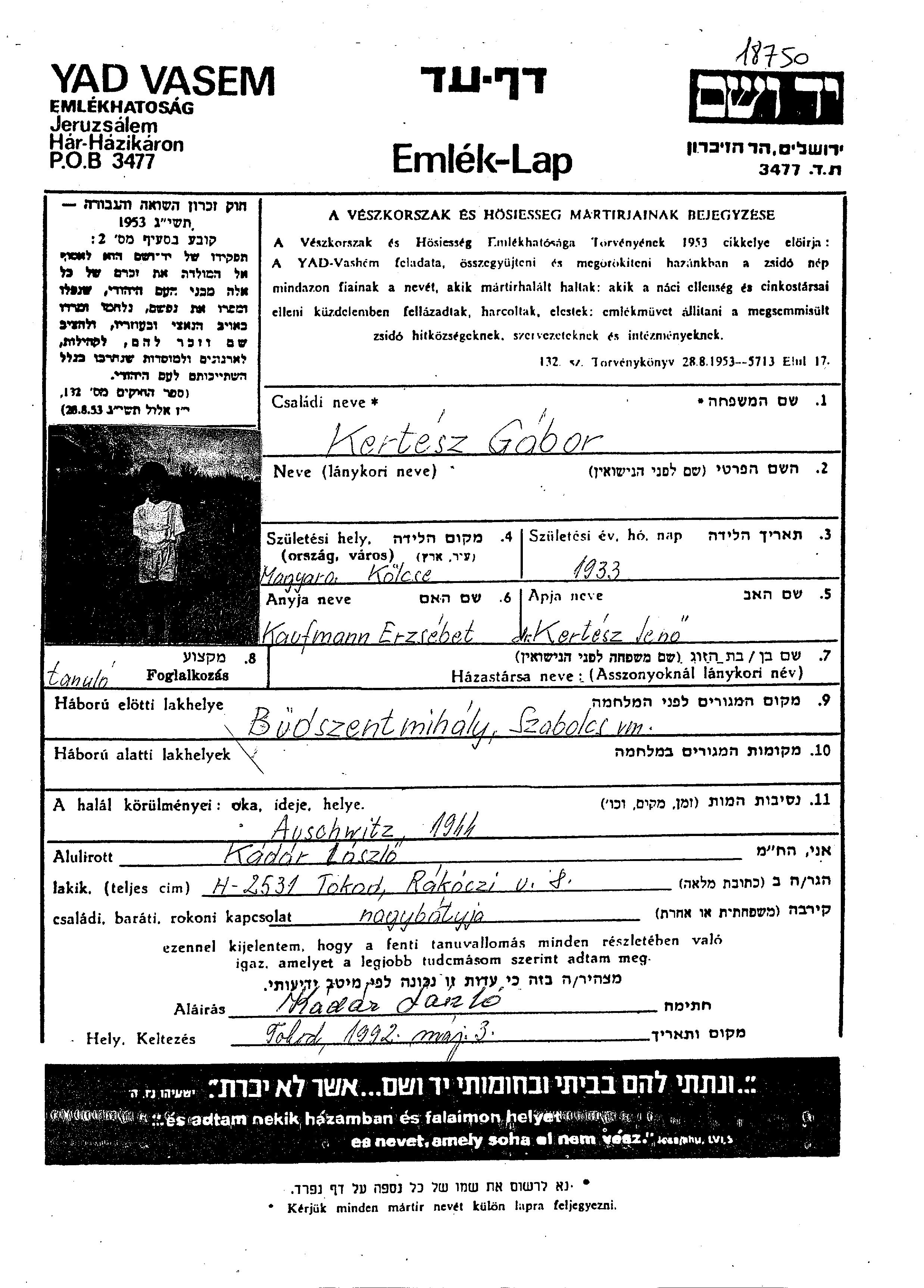 Кертес Габор 1933 Будсентмихай, Венгрия Лист свидетельских показаний