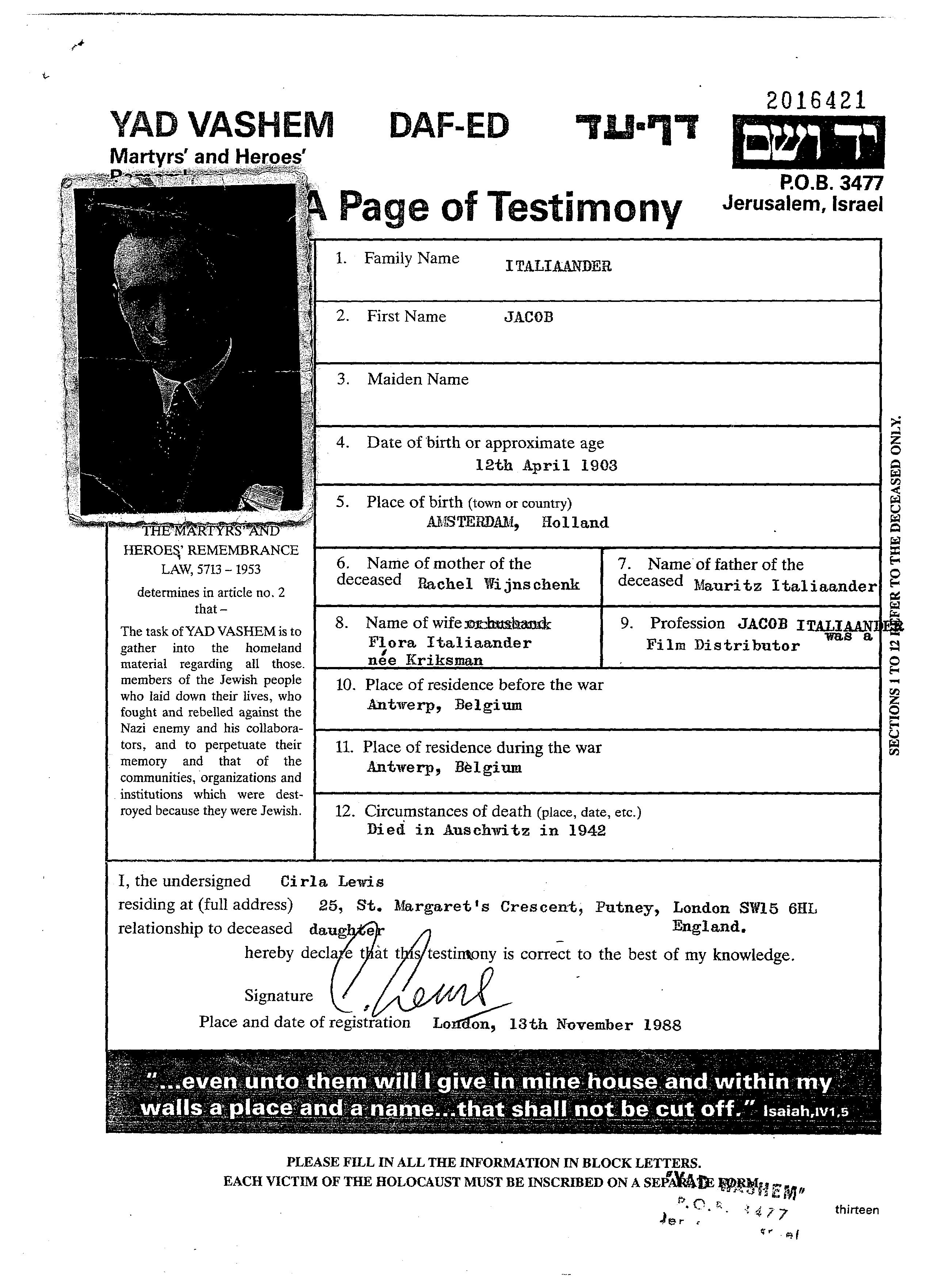 Якоб Италиандер, место рождения: Амстердам, Нидерланды. Предприниматель. Место жительства до войны: Антверпен, Бельгия.