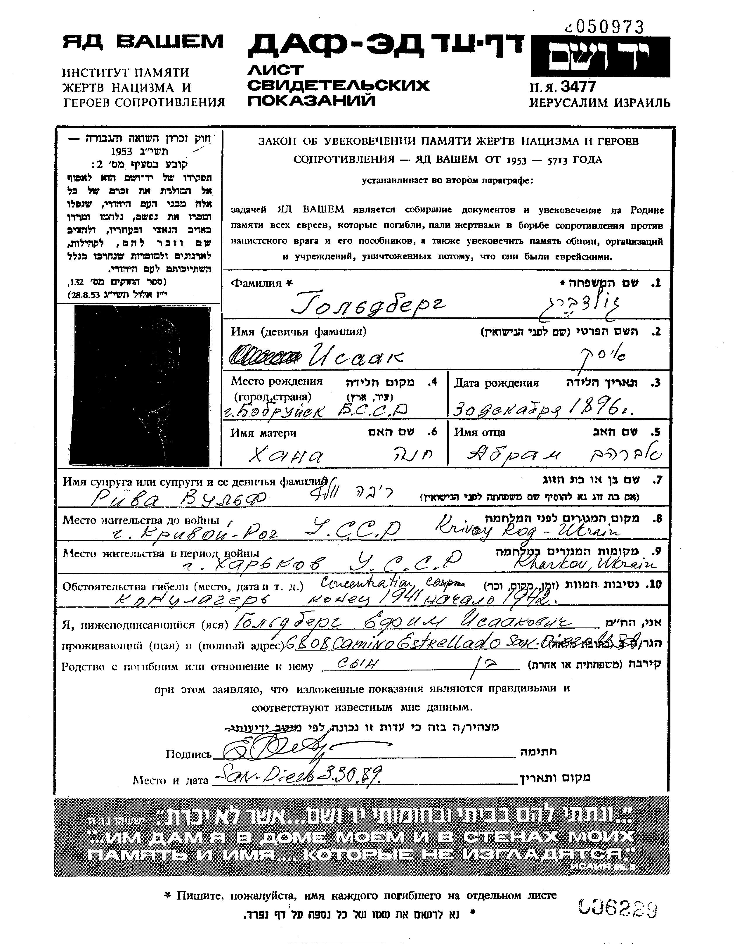 Гольдберг Исаак 1896 Кривой Рог, Украина (СССР) Лист свидетельских показаний
