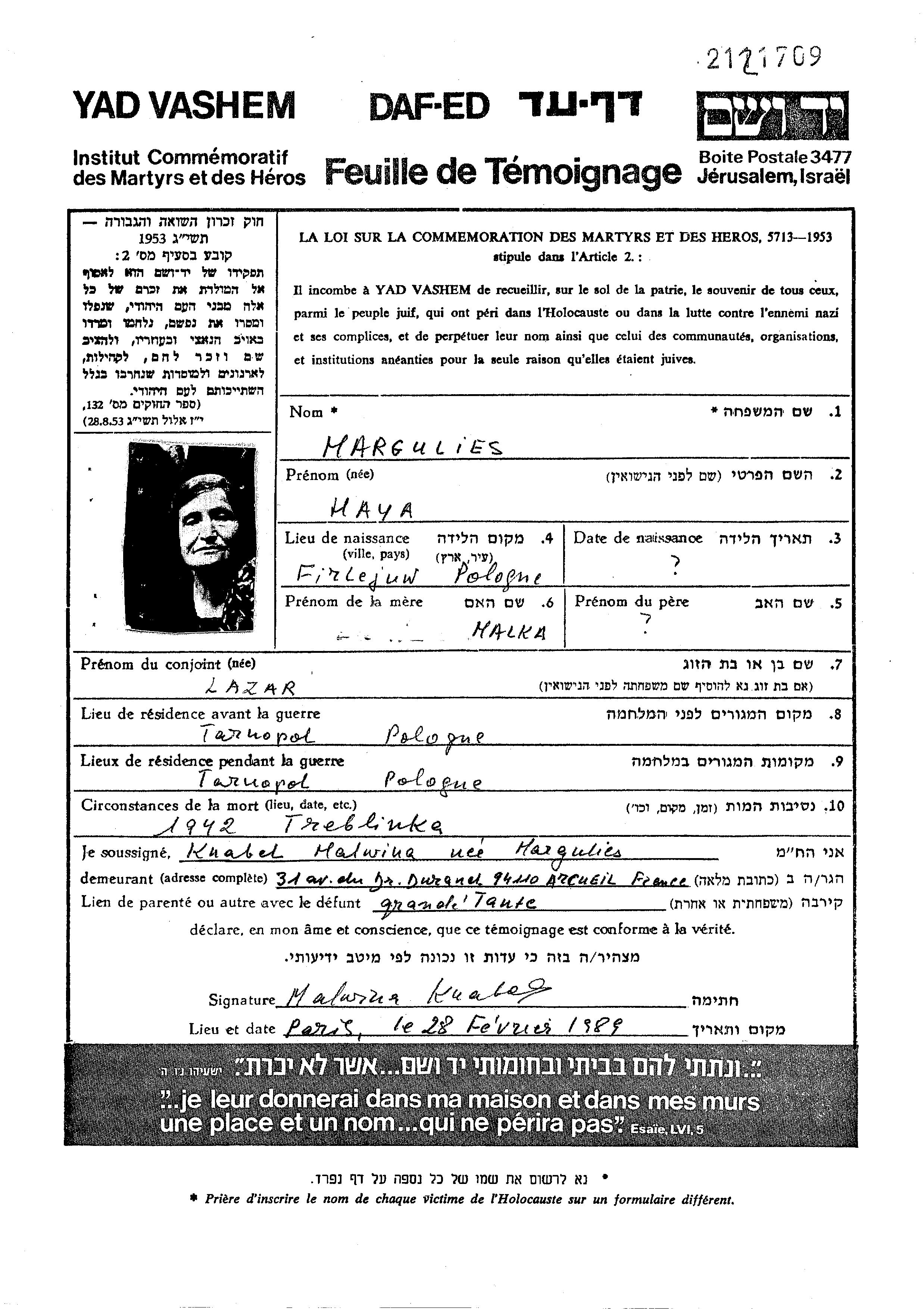 Маргулес Хая Тарнополь, Польша Лист свидетельских показаний