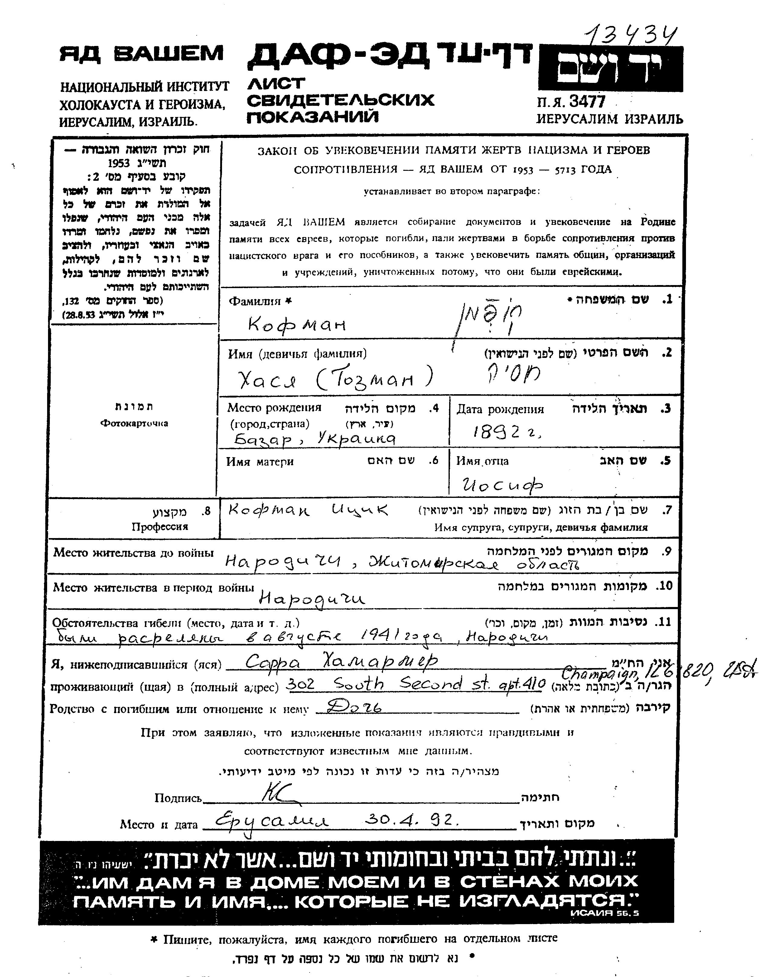 Кофман Хася 1892 Народичи, Украина (СССР) Лист свидетельских показаний