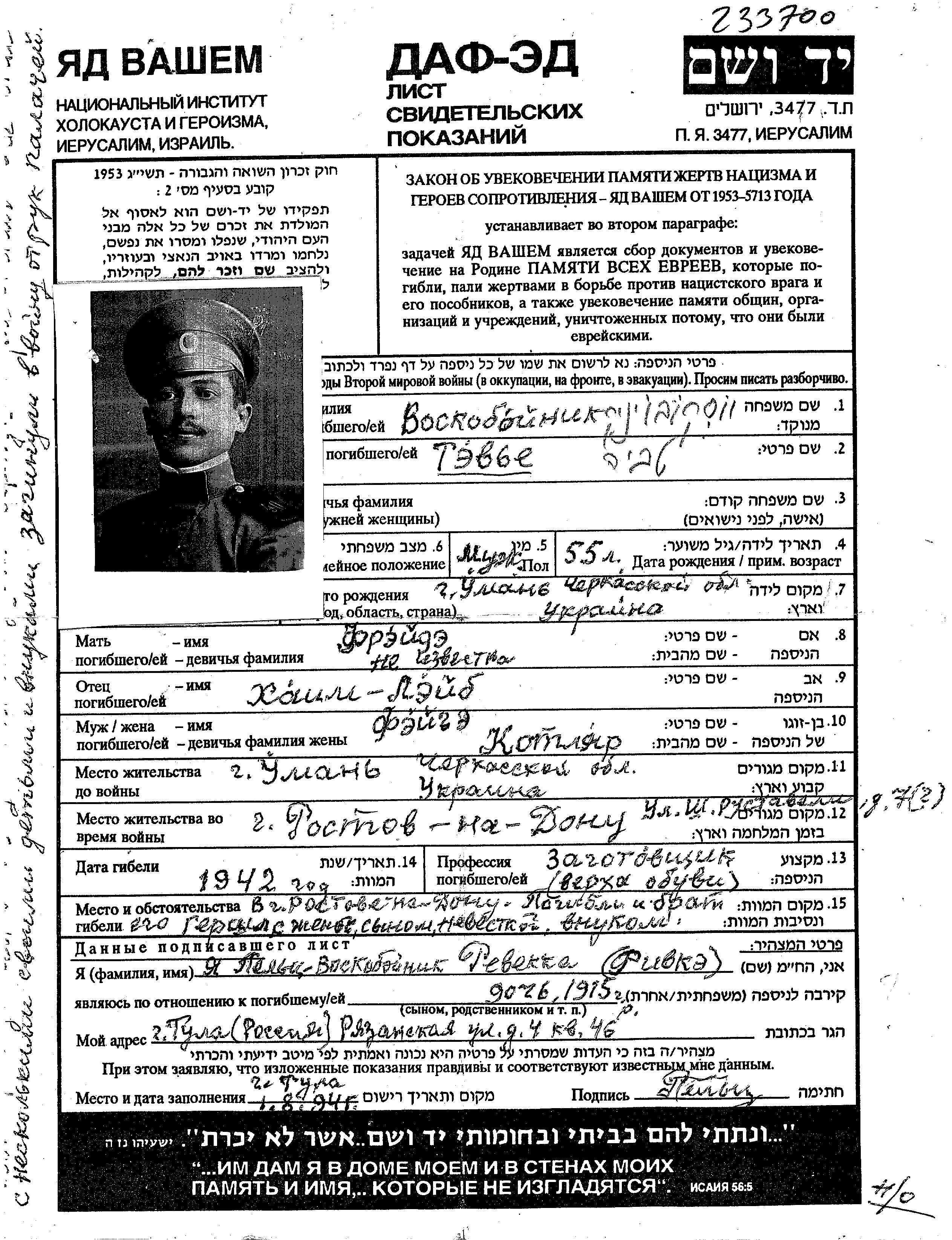 Тевье Воскобойник, место рождения: Умань, Украина (СССР). Сапожник. Место жительства до войны: Умань, Украина (СССР).