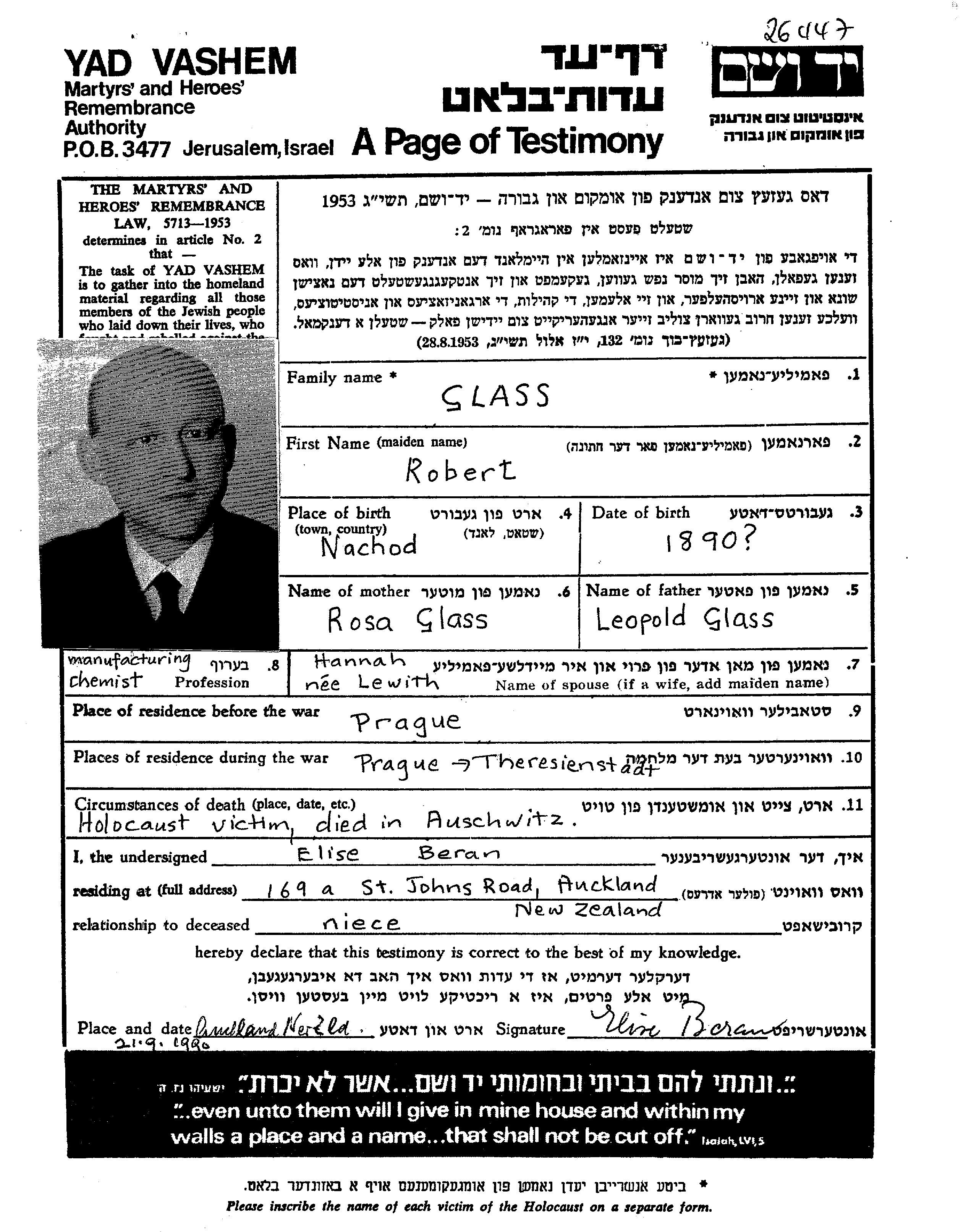 Роберт Гласс, место рождения: Наход, Чехословакия. Место жительства до войны: Прага, Чехословакия.