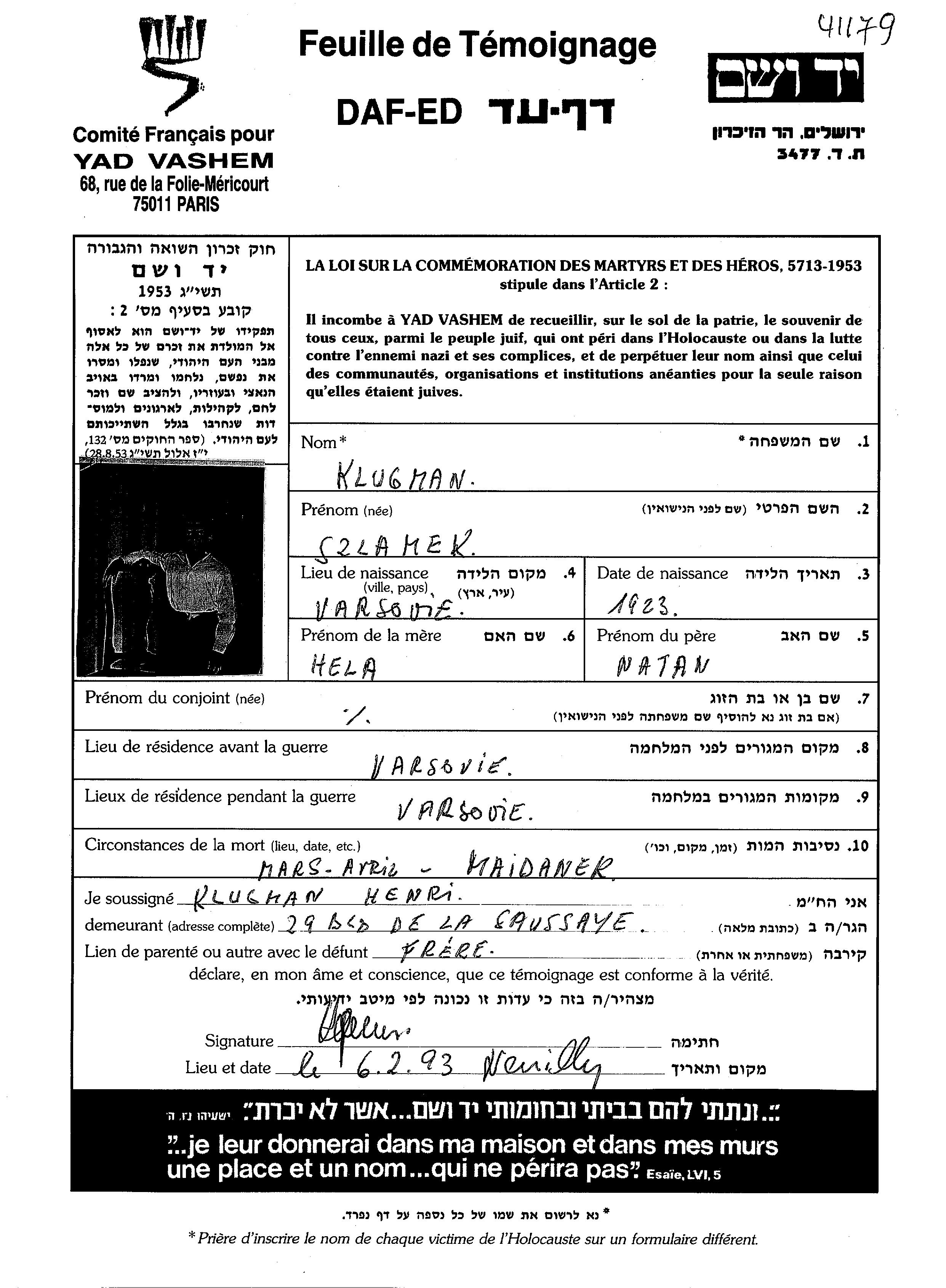 Клугман Шламек 1923 Варшава, Польша Лист свидетельских показаний