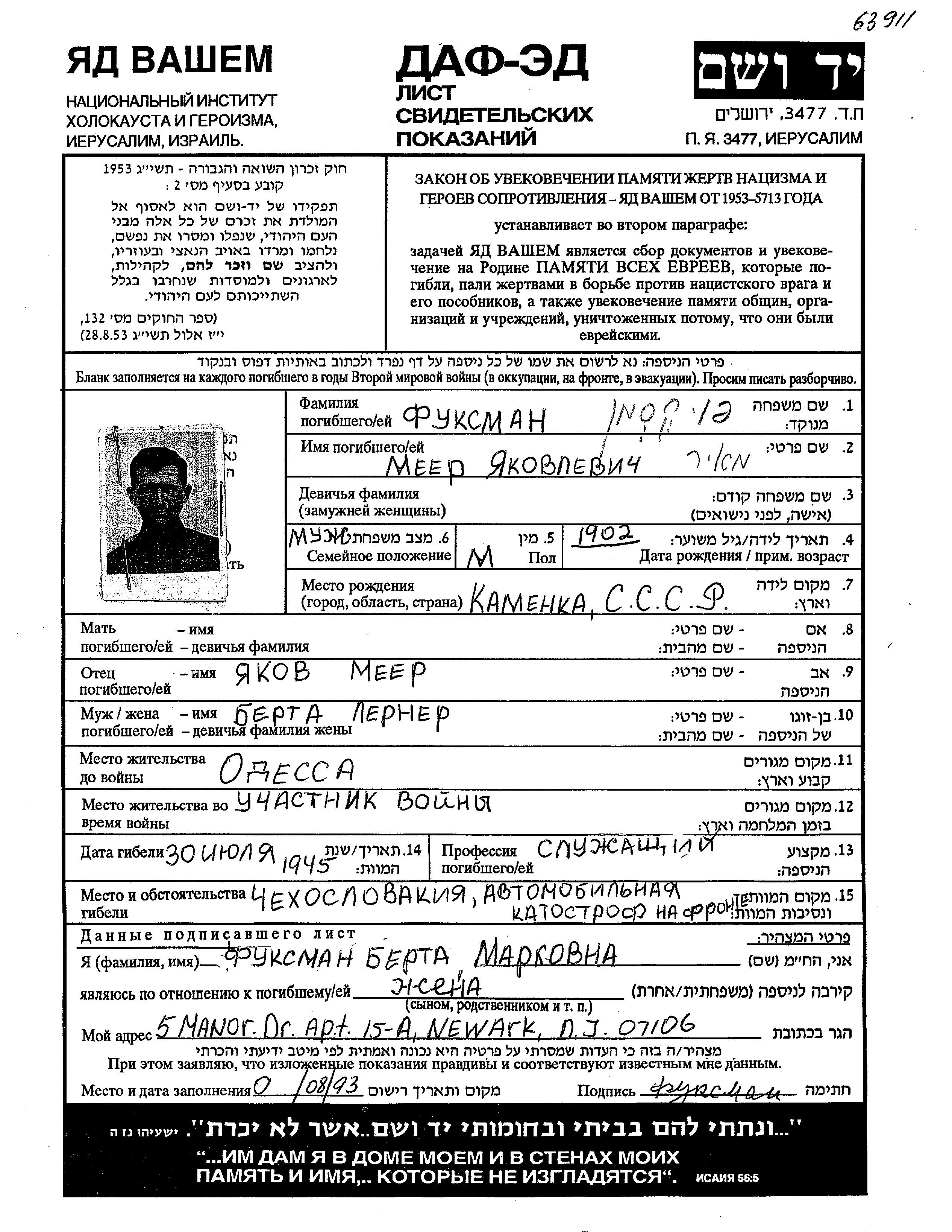 Меер Фуксман, место рождения: Каменка, Россия (СССР). Клерк. Место жительства до войны: Одесса, Украина (СССР).