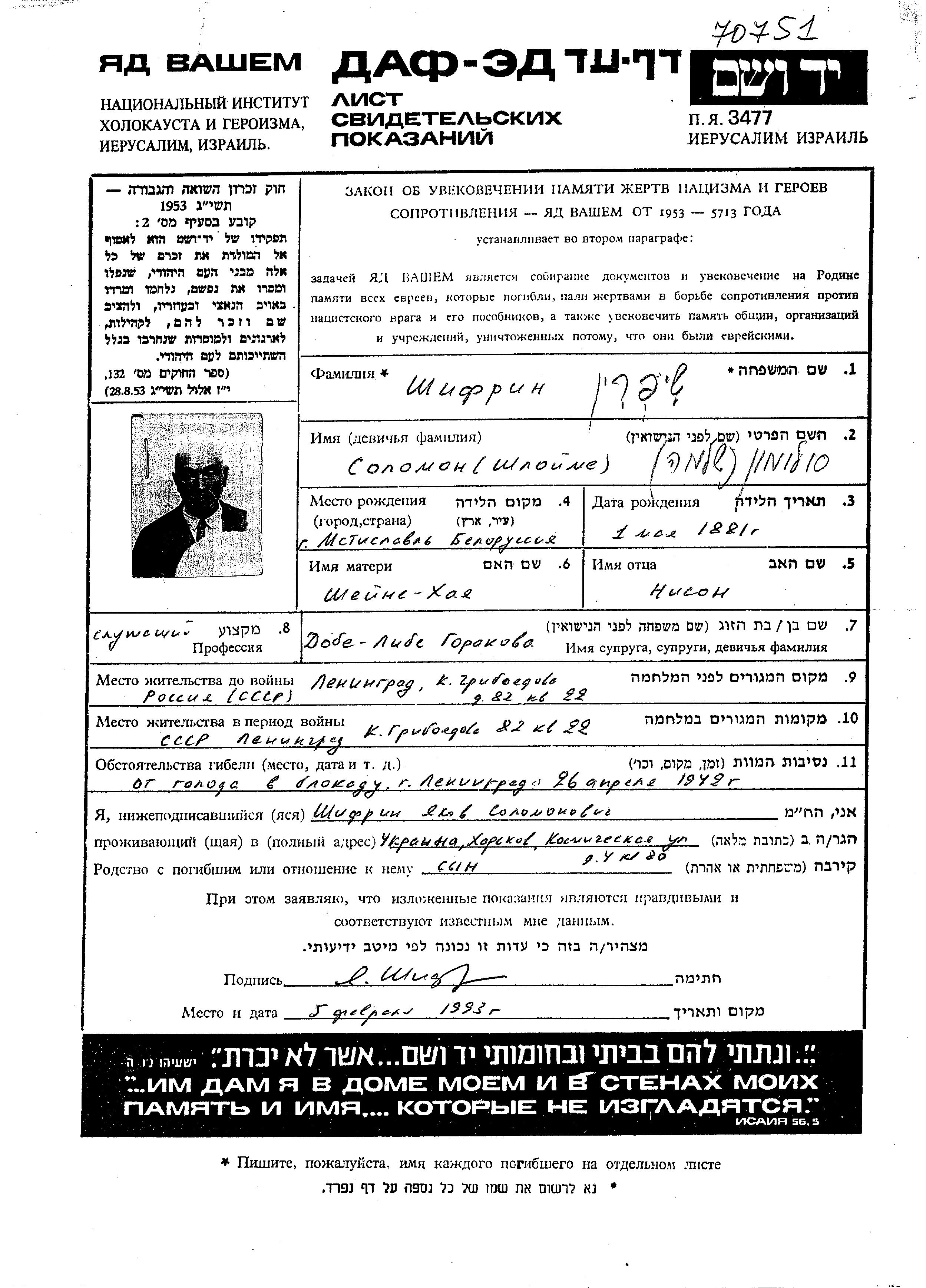 Соломон Шифрин, место рождения: Мстиславль, Белоруссия (СССР). Клерк. Место жительства до войны: Ленинград, Россия (СССР). Соломон погиб/ла в период 1933-1945 годов в результате опосредованного воздействия Шоа. место смерти: Ленинград, Россия (СССР) в 26/04/1942.
