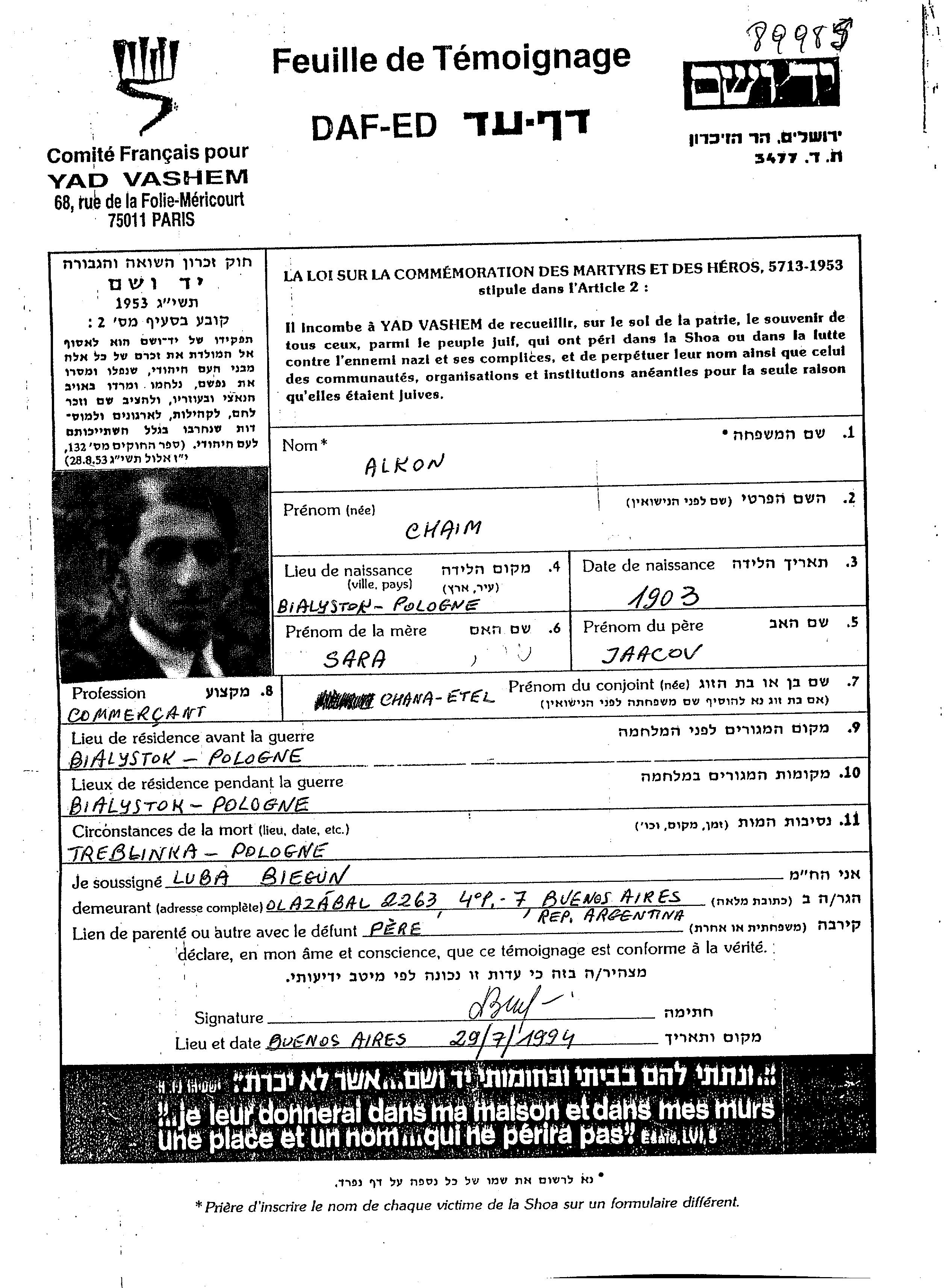 Алькон Хаим 1903 Белосток, Польша Лист свидетельских показаний