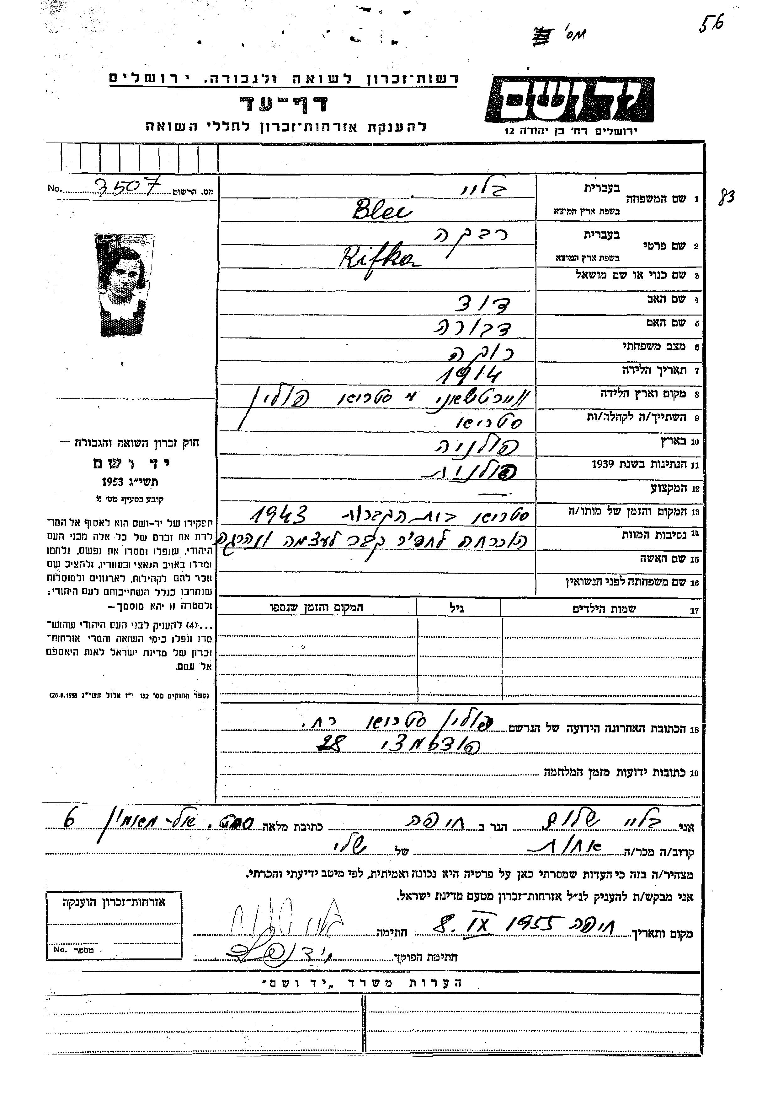 Рифка Блай, место рождения: Verchany, Польша. Место жительства до войны: Стрый, Польша.