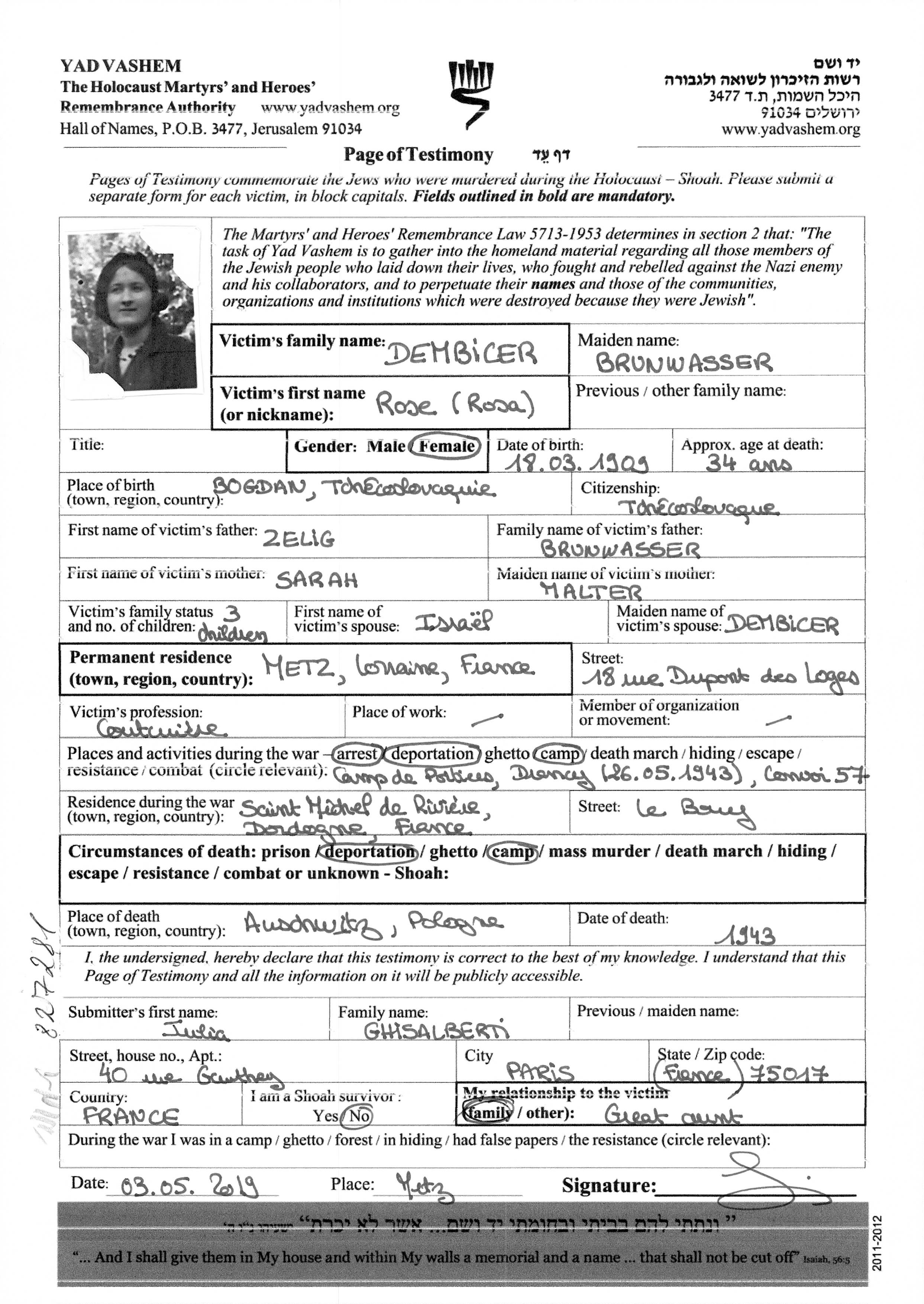 Розе Дембицер, девичья фамилия Брунвассер, место рождения: Богдан, Чехословакия. Швея. Место жительства до войны: Мец, Франция.