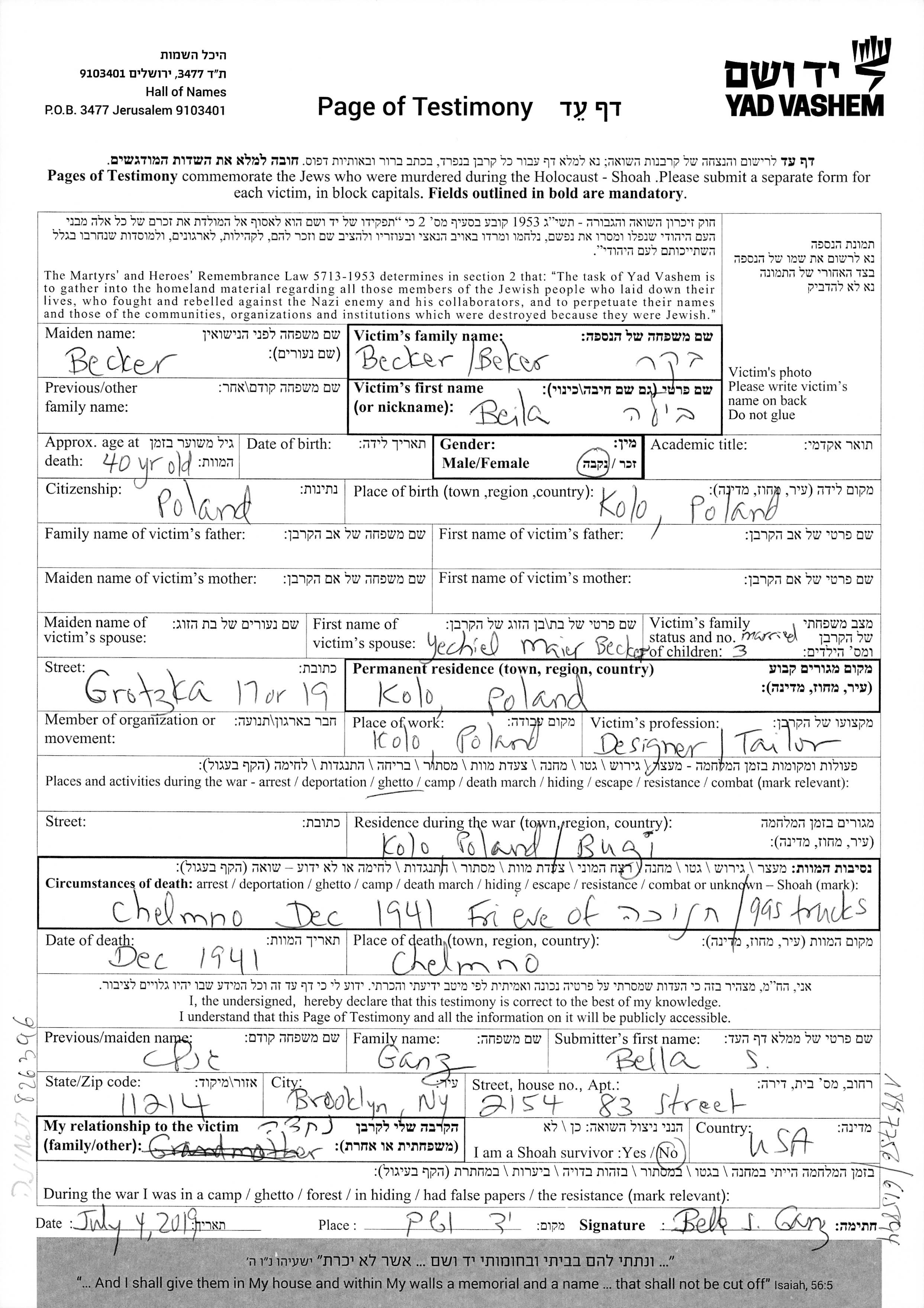 Бекер Бейла Коло, Польша Лист свидетельских показаний