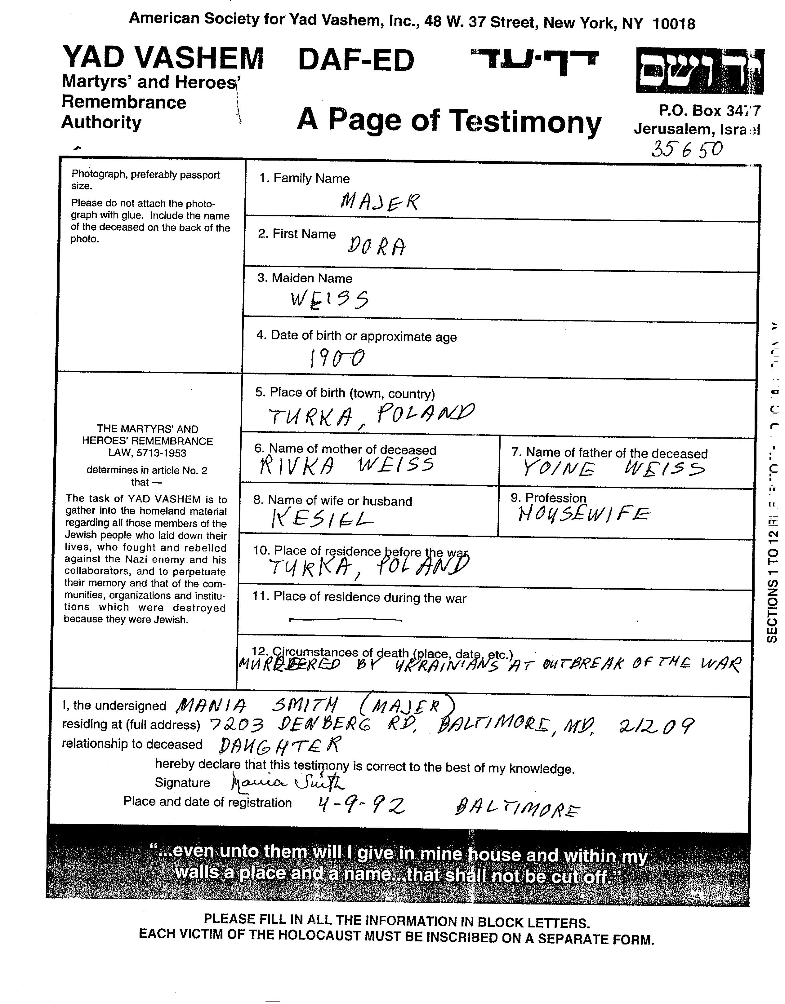 Дора Маер, девичья фамилия Вайсс, место рождения: Турка Над Стрыем, Польша. Отец: Йоине, mать:Ривка. Домохозяйка. Женат / замужем. Место жительства до войны: Турка Над Стрыем, Польша. Место во время войны: Турка Над Стрыем, Польша.