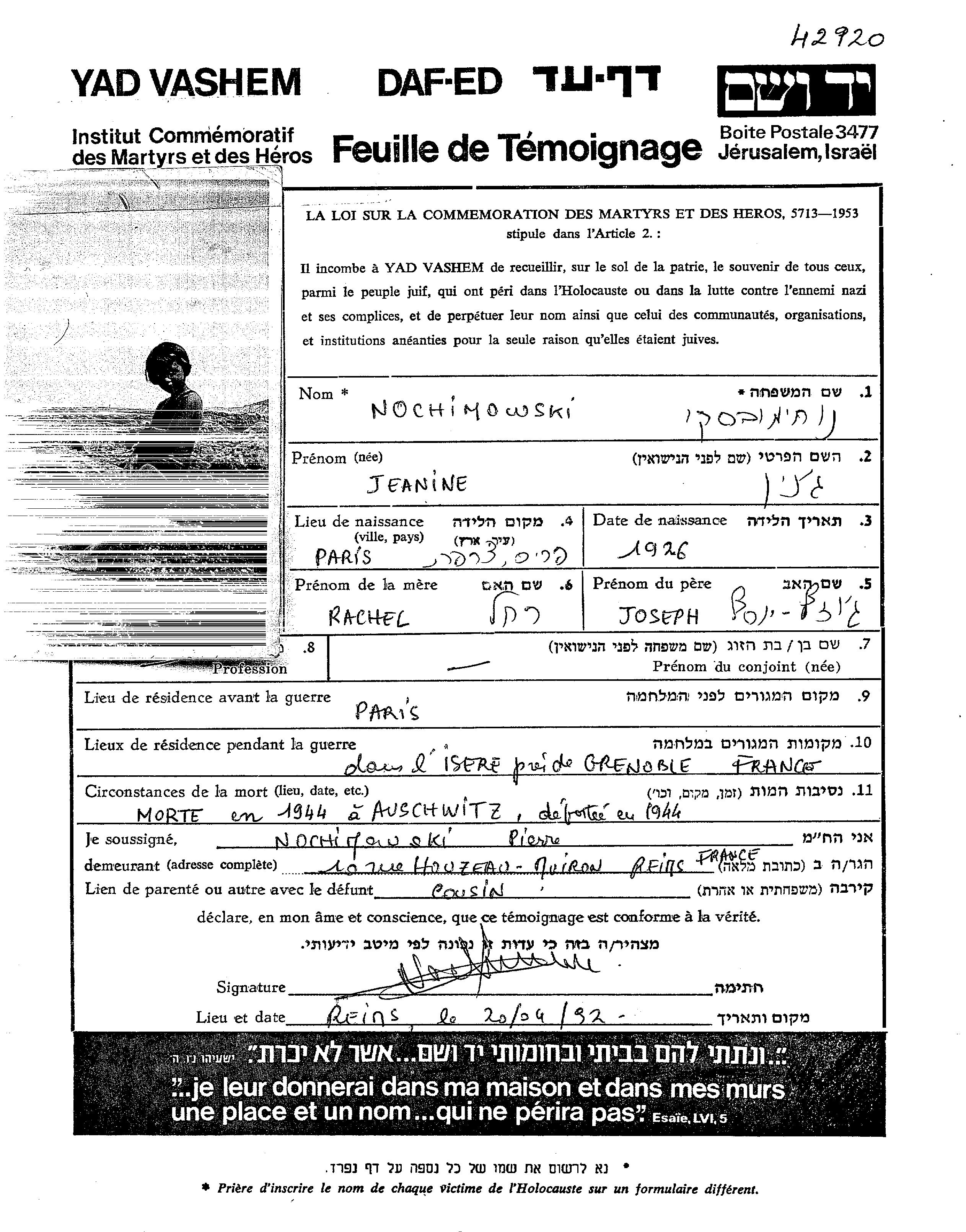 Нохимовски | Жанин | 1926 | Париж, Франция | Лист свидетельских показаний |