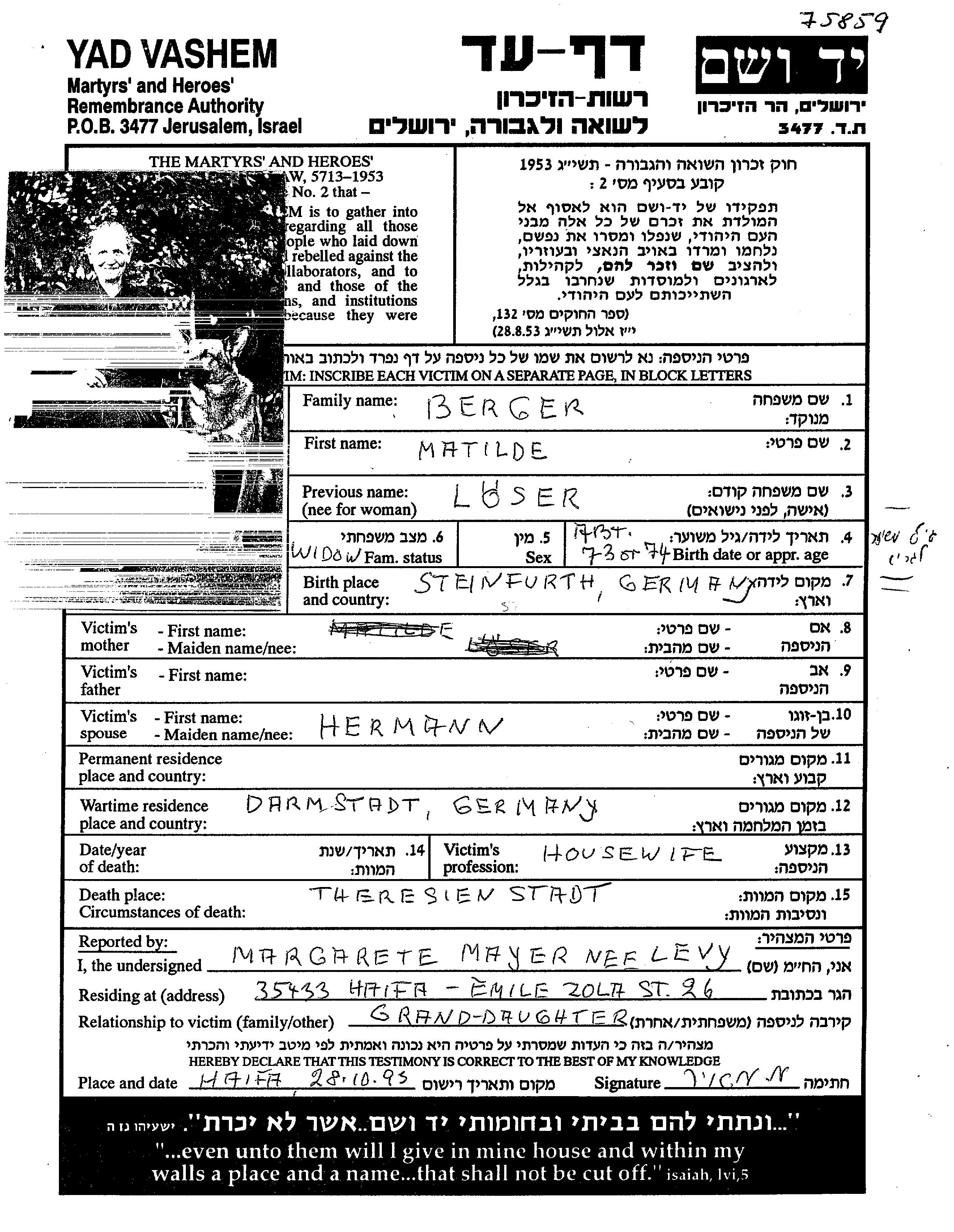 Матильде Бергер, девичья фамилия Лёзер Лазар, место рождения: Штейнсфурт, Германия. Домохозяйка. Место жительства до войны: Дармштадт, Германия.