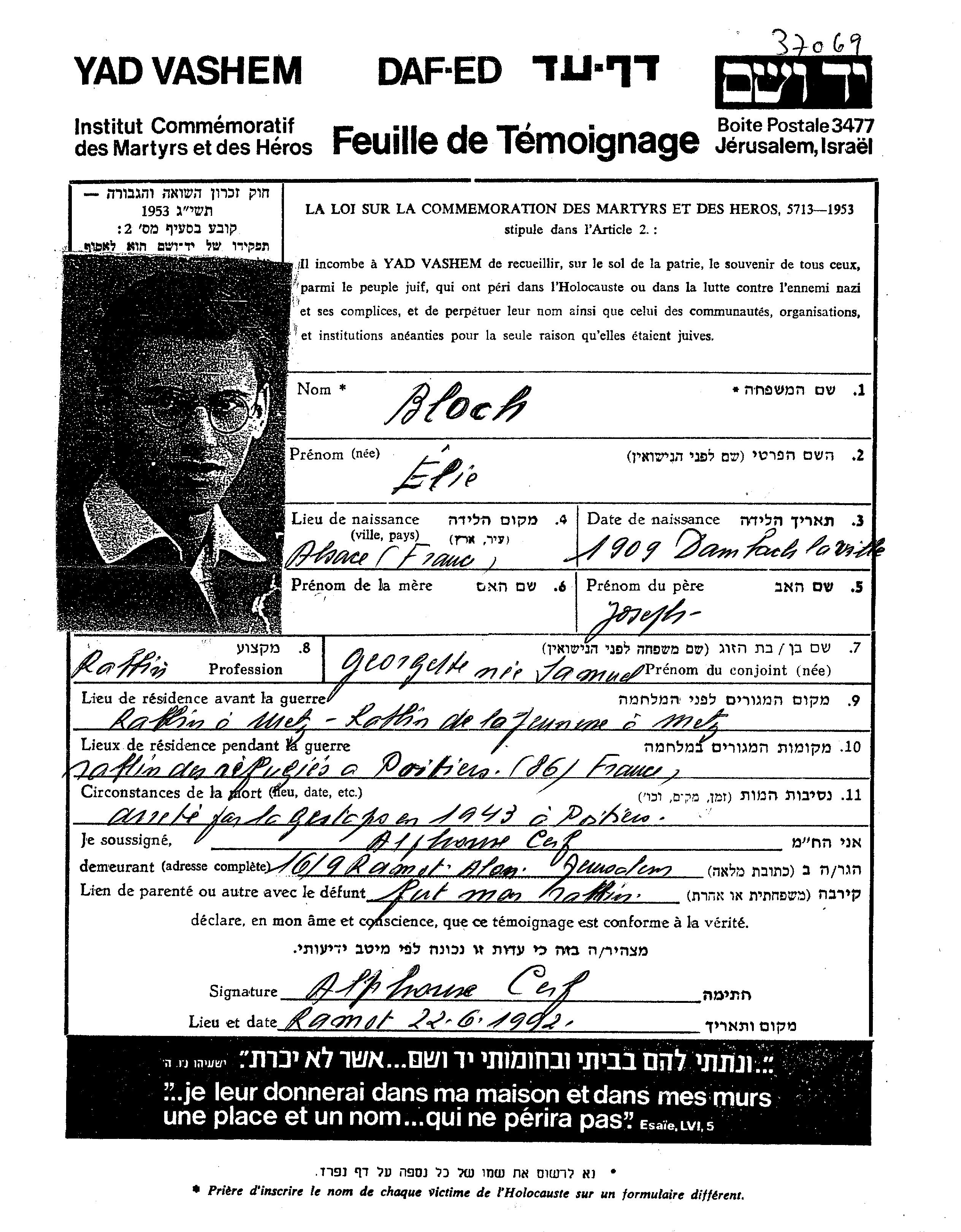 Блох Эли 1909 Мец, Франция Лист свидетельских показаний