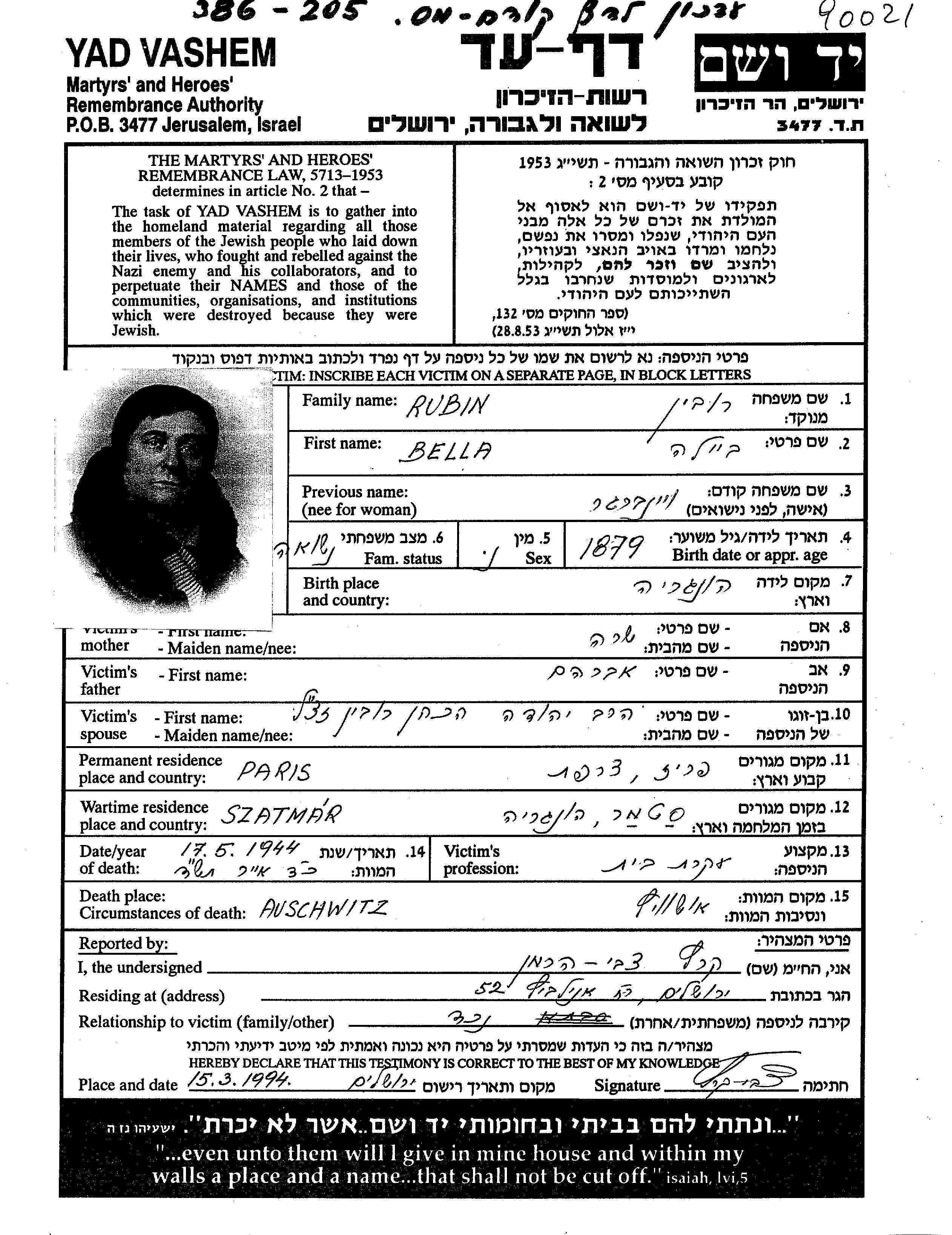 Белла уничтоженa в период Шоа. место смерти: Аушвиц, Польша в 17/05/1944.