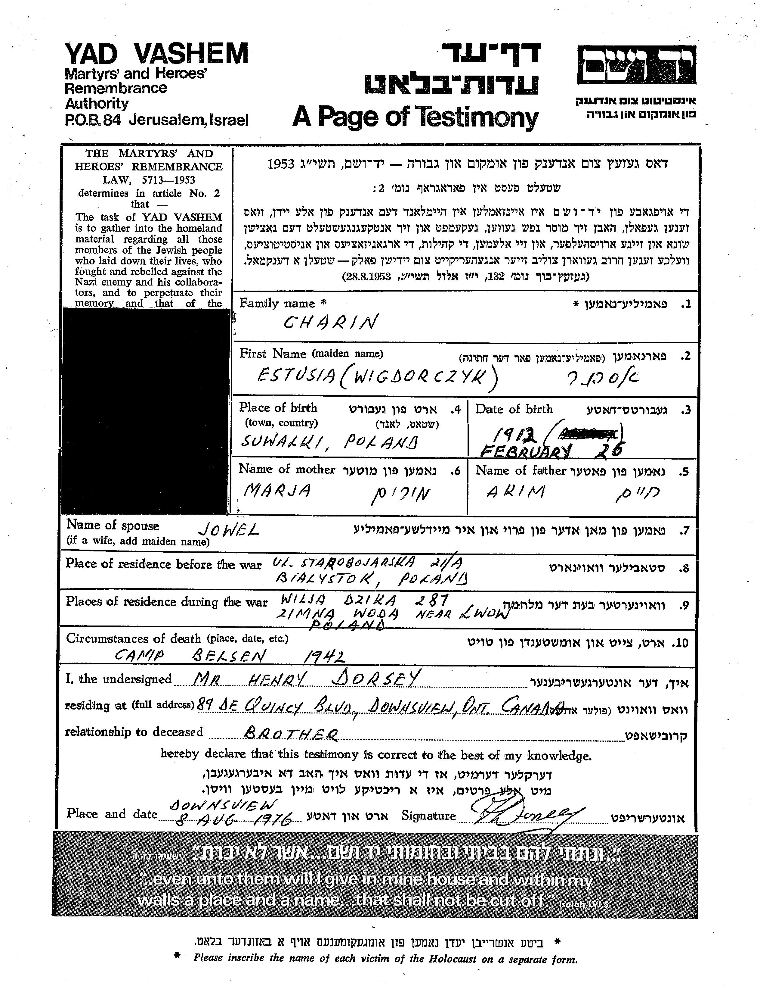 | Харин | Эстер | 1914 | Белосток, Польша | Лист свидетельских показаний |