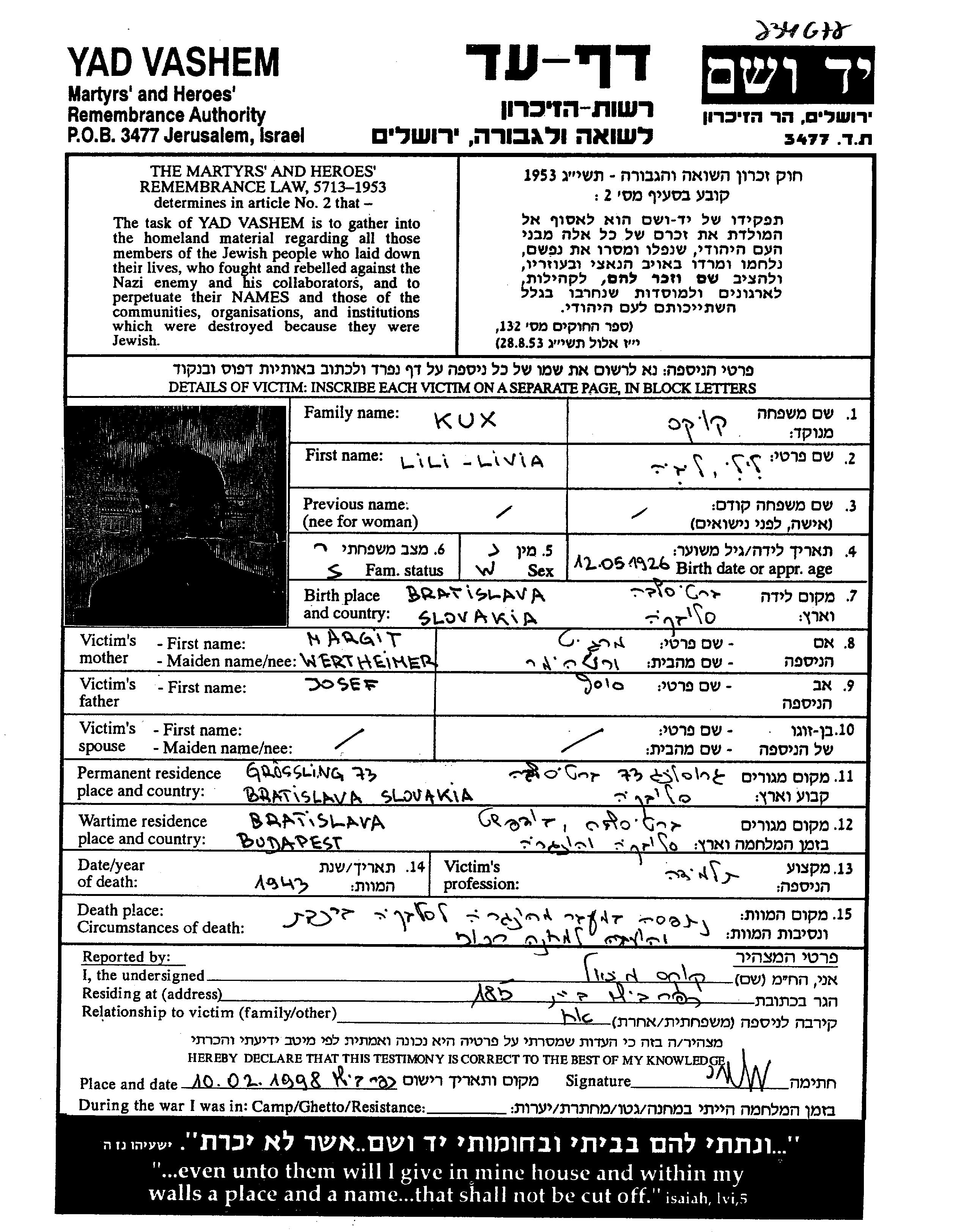 Кукс Лили Ливия 1926 Братислава, Чехословакия Лист свидетельских показаний