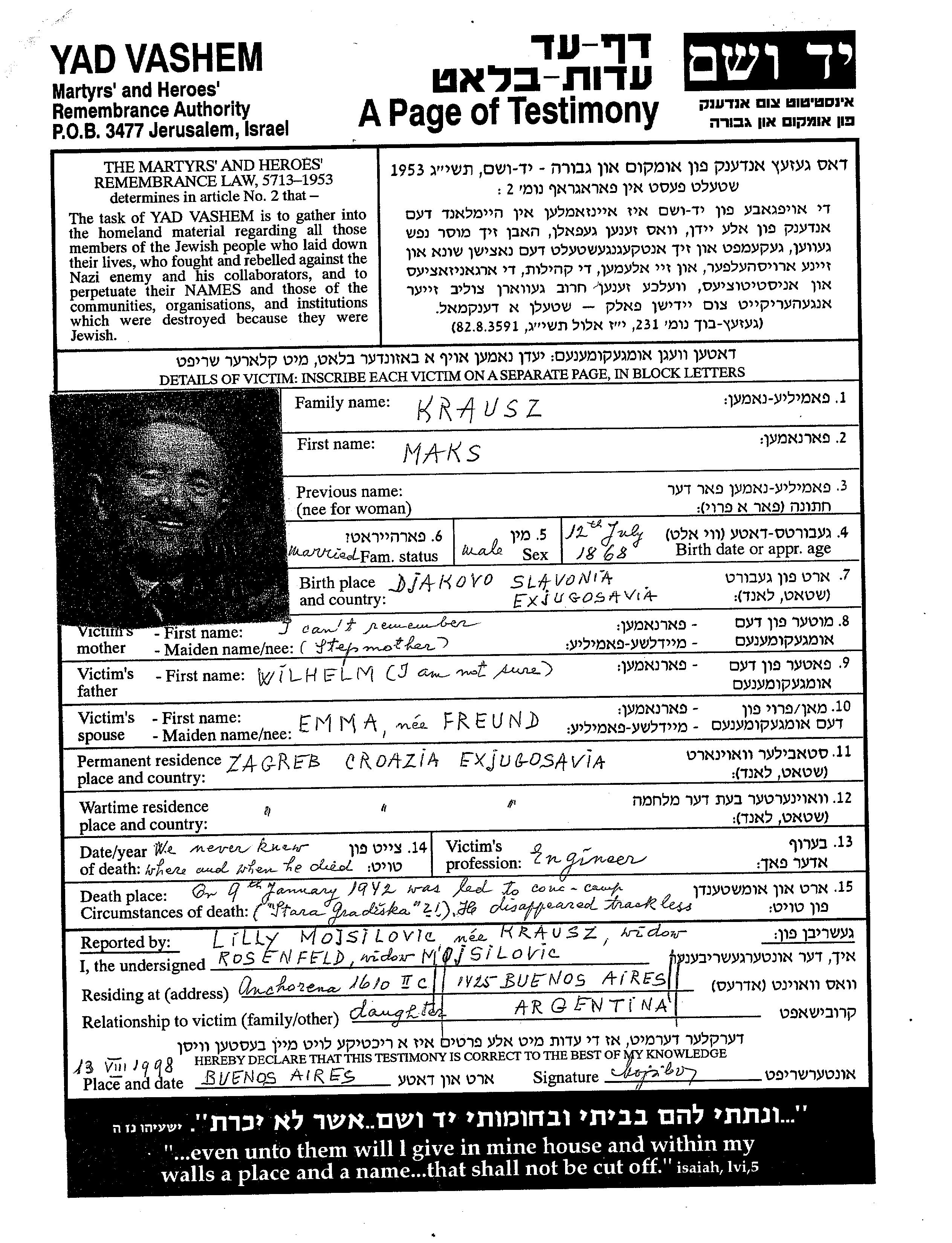 Макс Краус, место рождения: Джяково, Югославия. Инженер. Место жительства до войны: Загреб, Югославия.